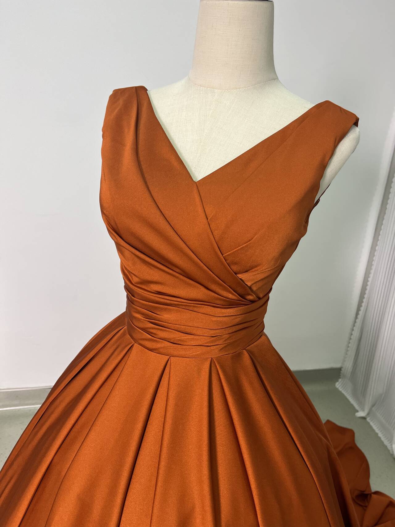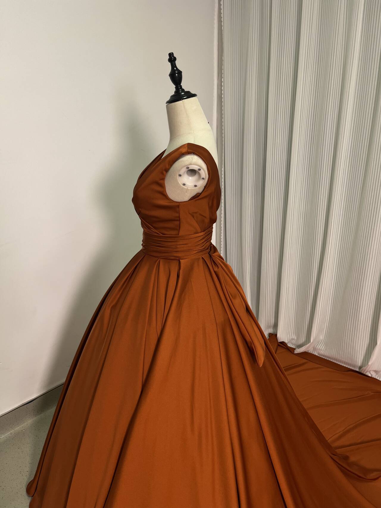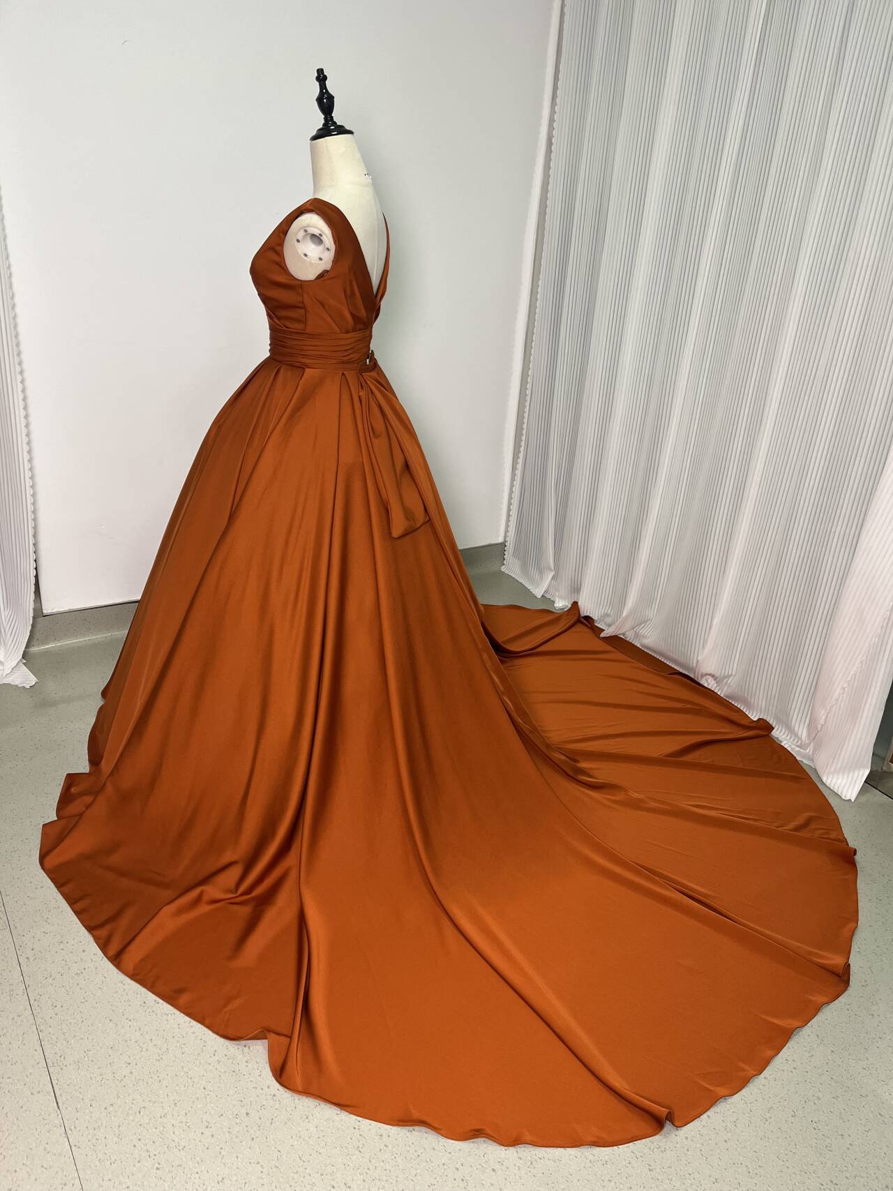 高級イタリアサテン テラコッタ色 Vネック カラードレス 華やかなトレーン /結婚式披露