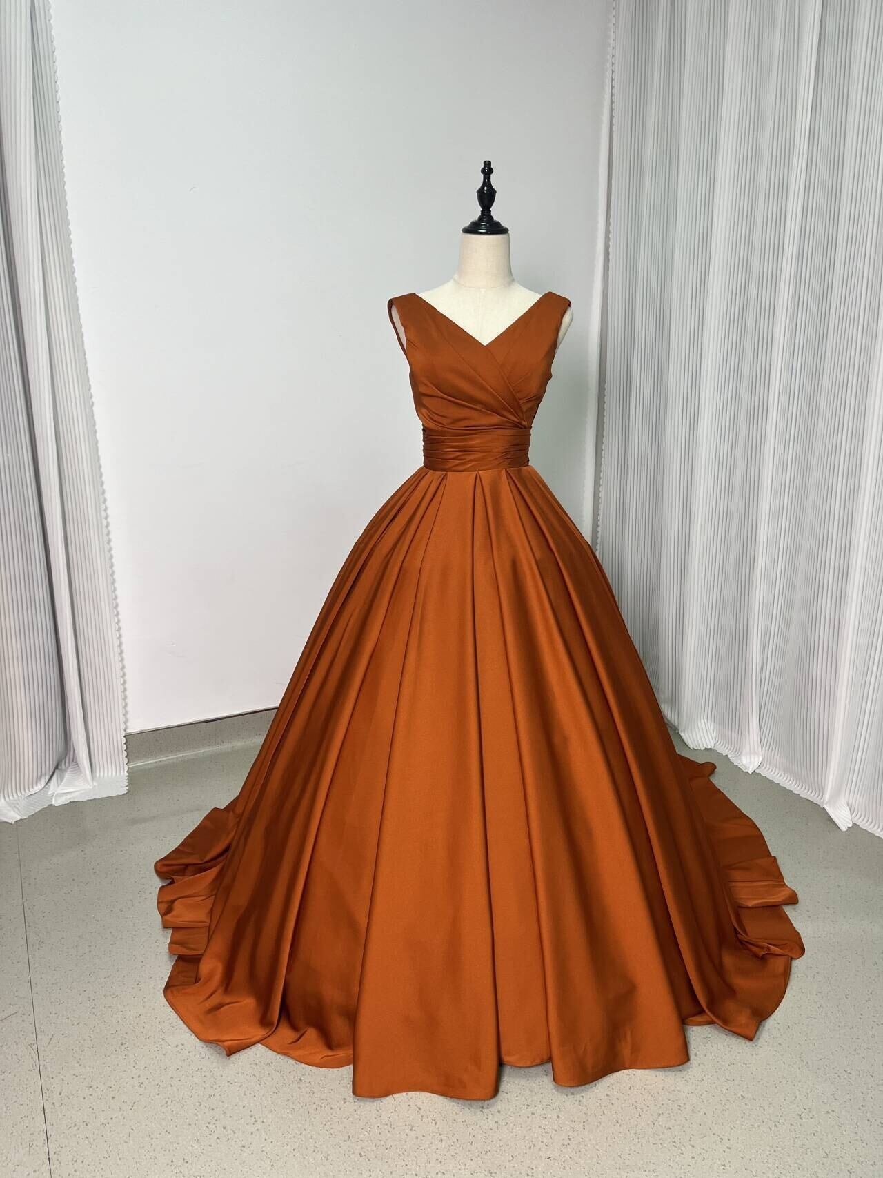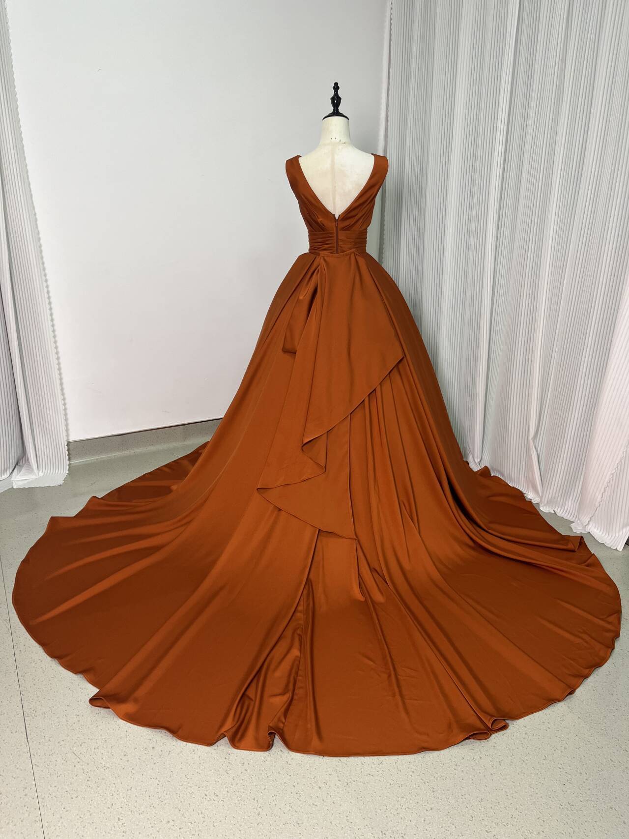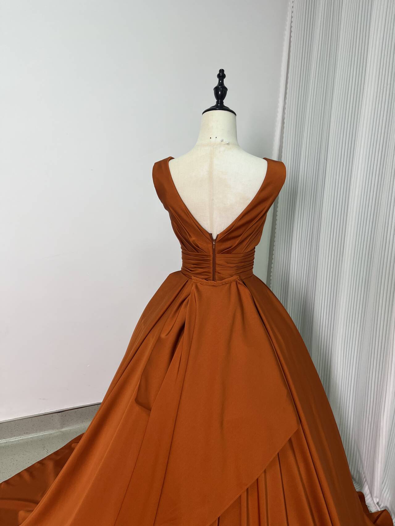 高級イタリアサテン テラコッタ色 Vネック カラードレス 華やかなトレーン /結婚式披露