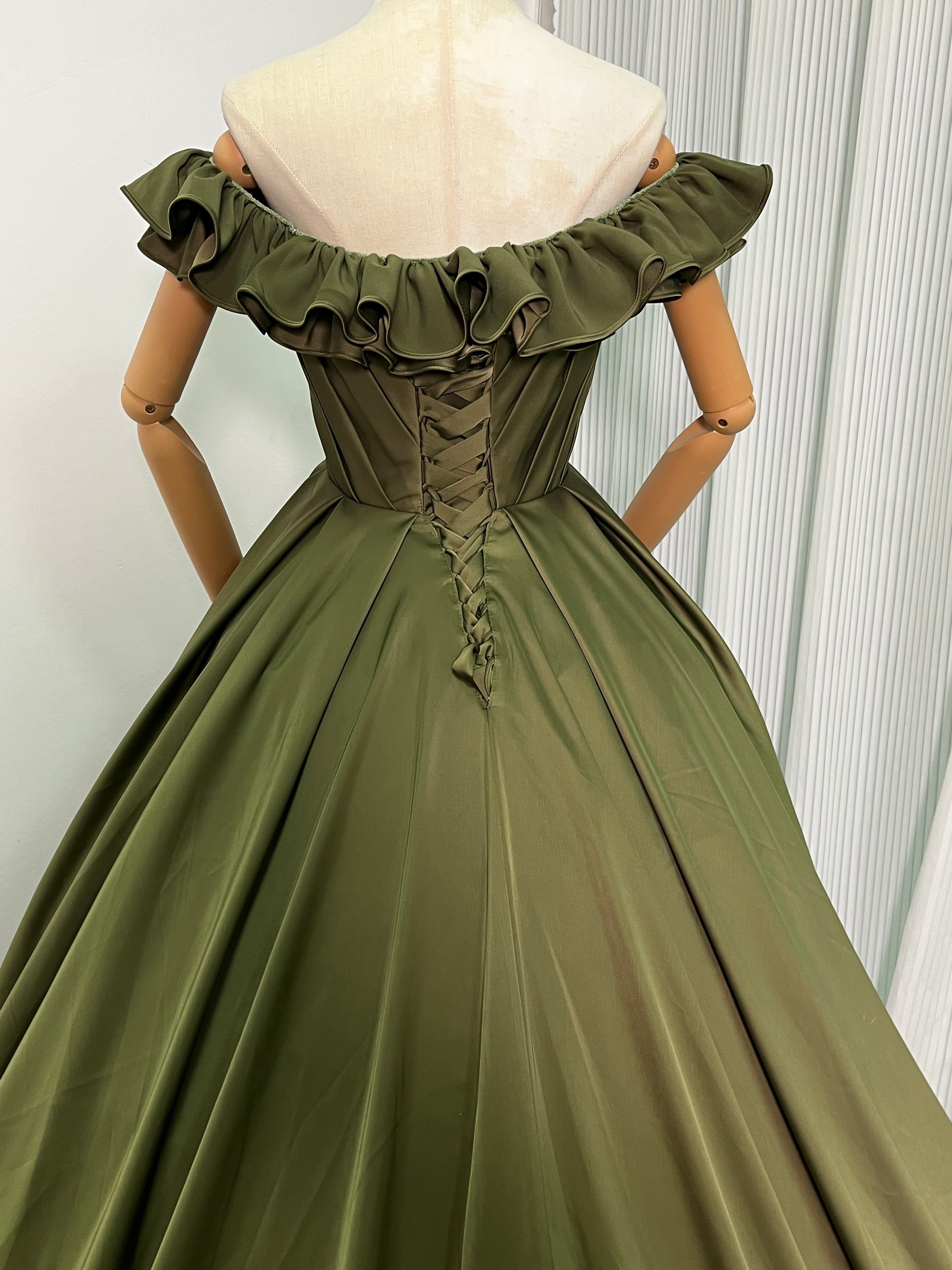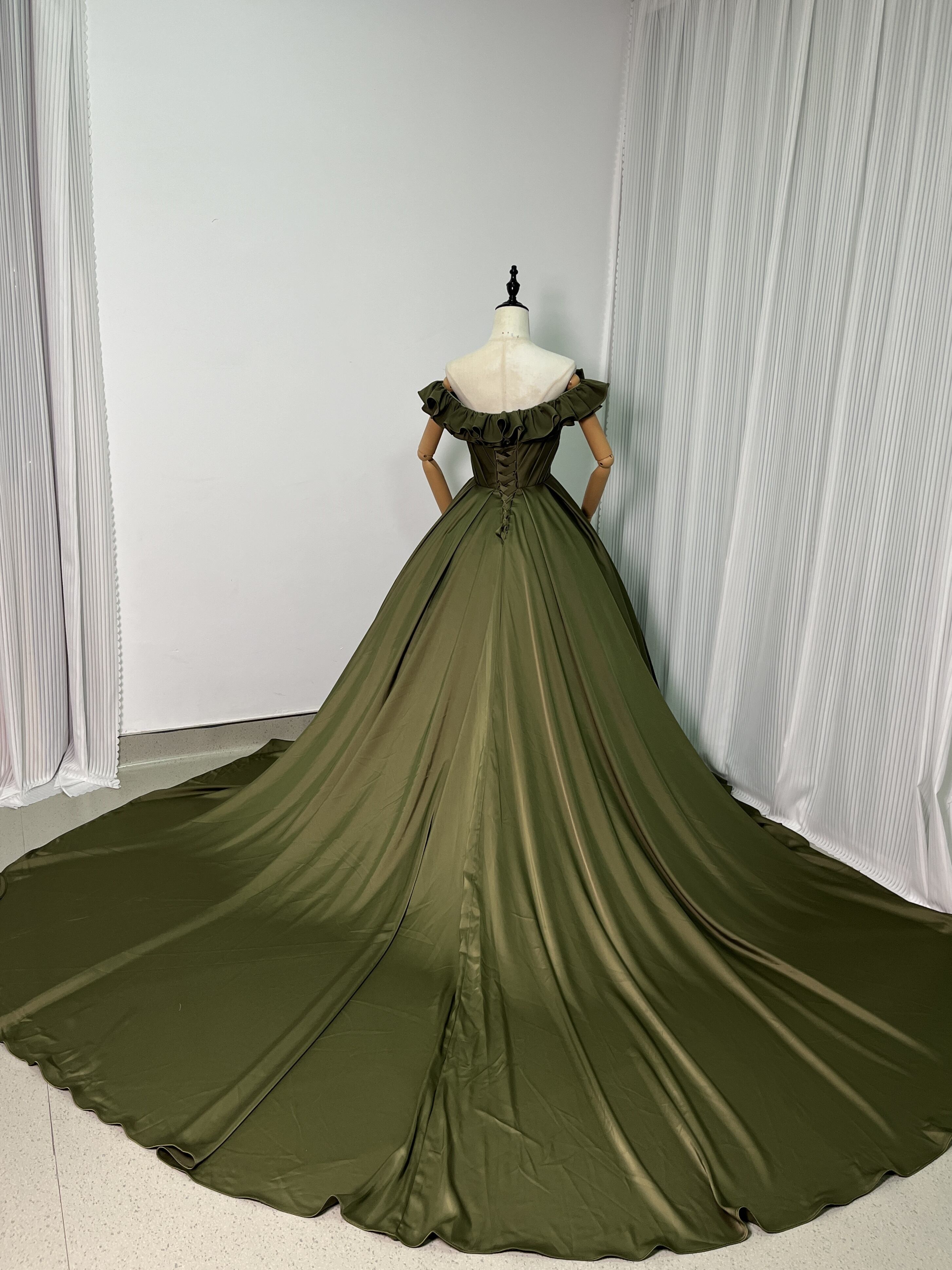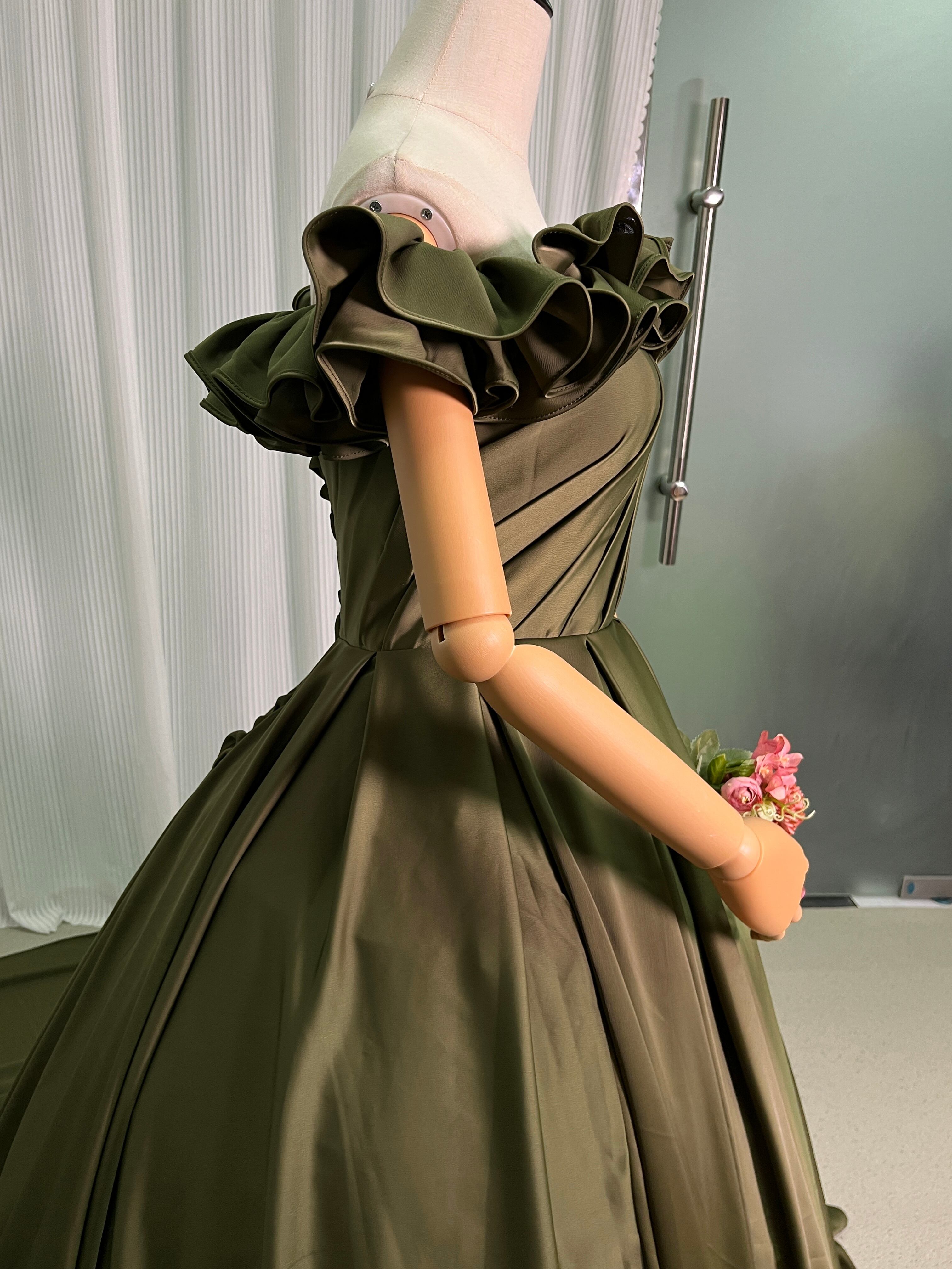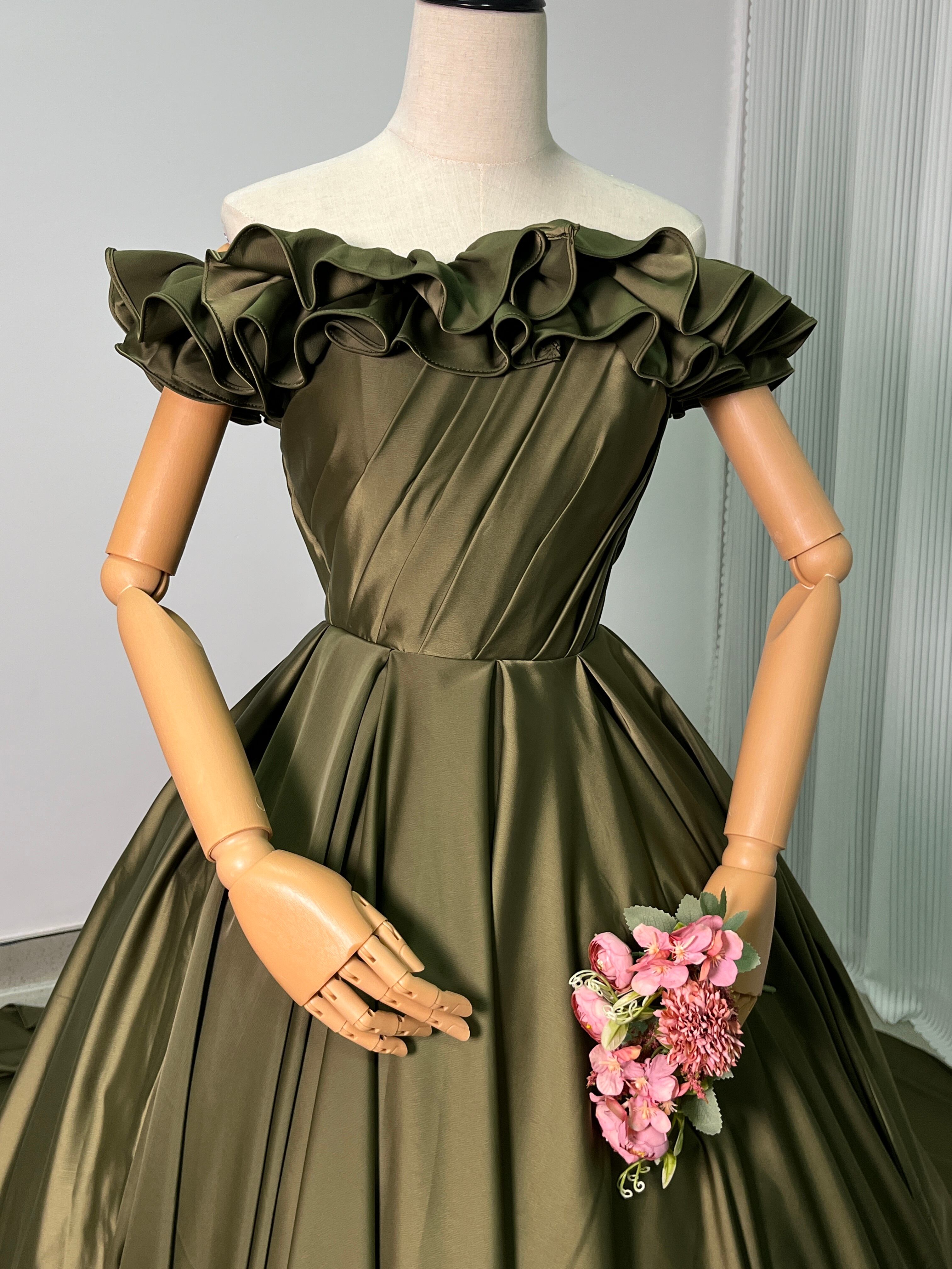 大好評中! 深めな緑 取り外しオフショルダー プ カラードレス 編み上げ 華やかなトレーン /結婚式披露