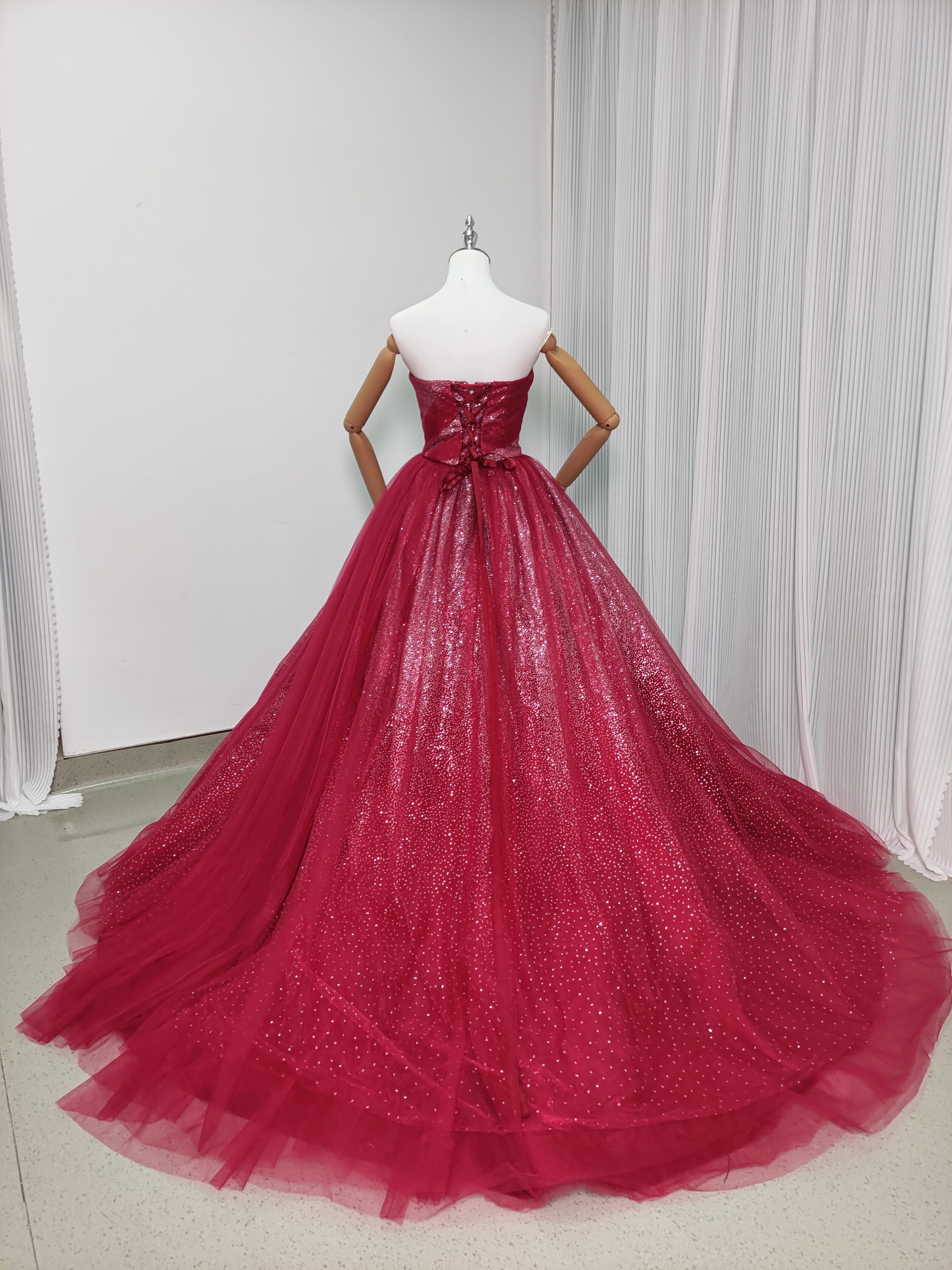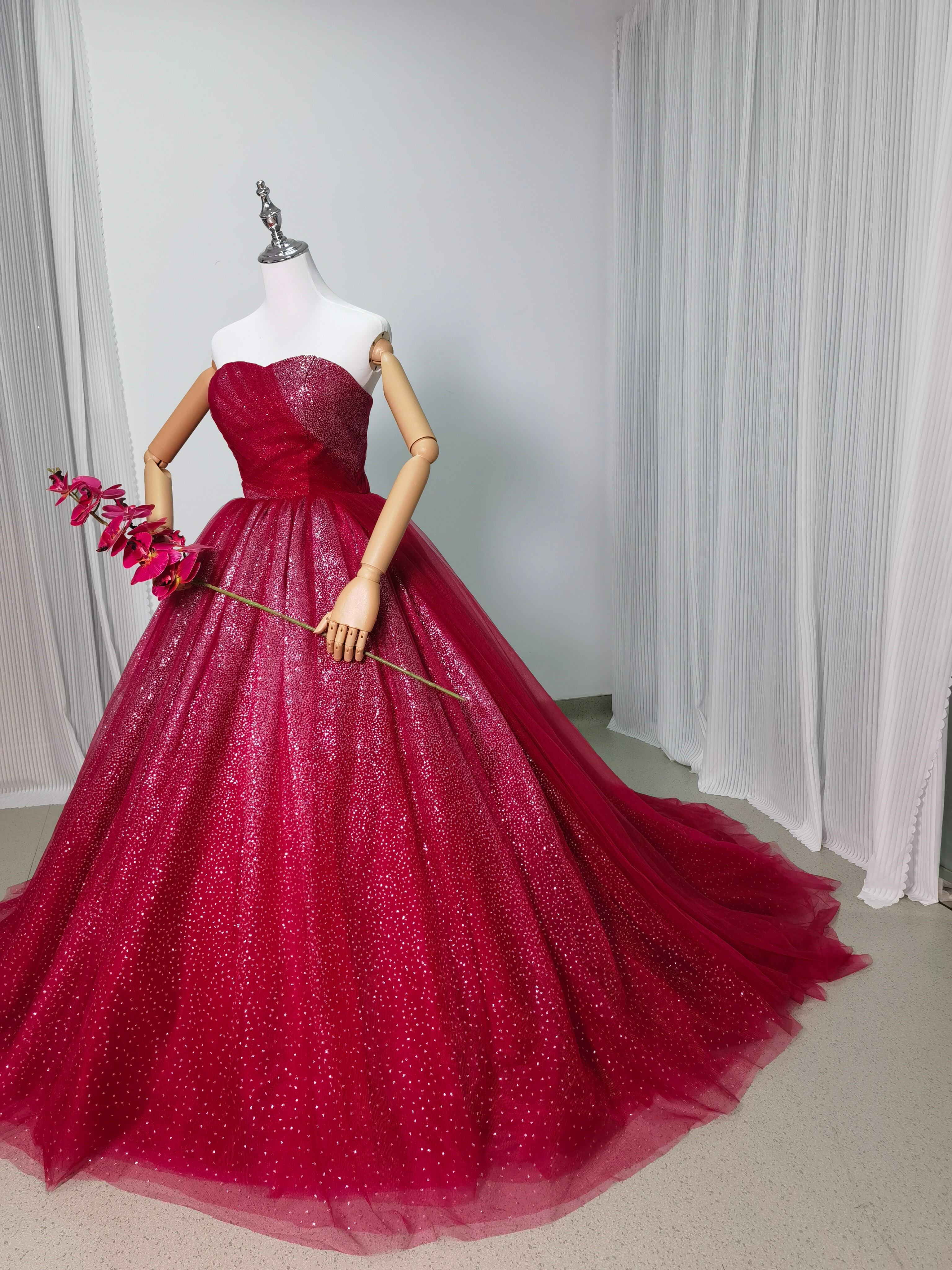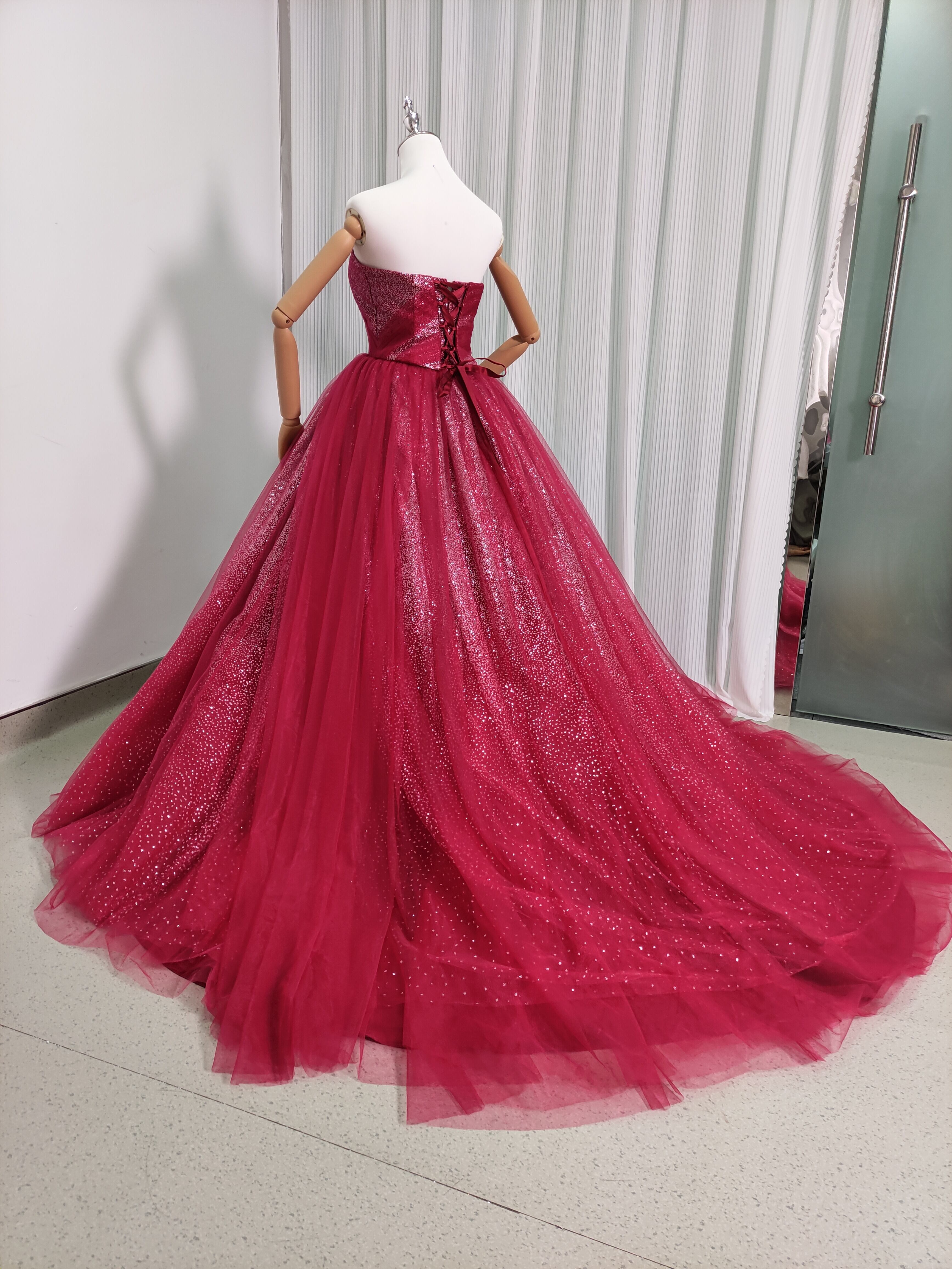大好評中! ワインレッド ベアトップ キラキラチュー ル カラードレス 編み上げ プリンセスライン /結婚式披露