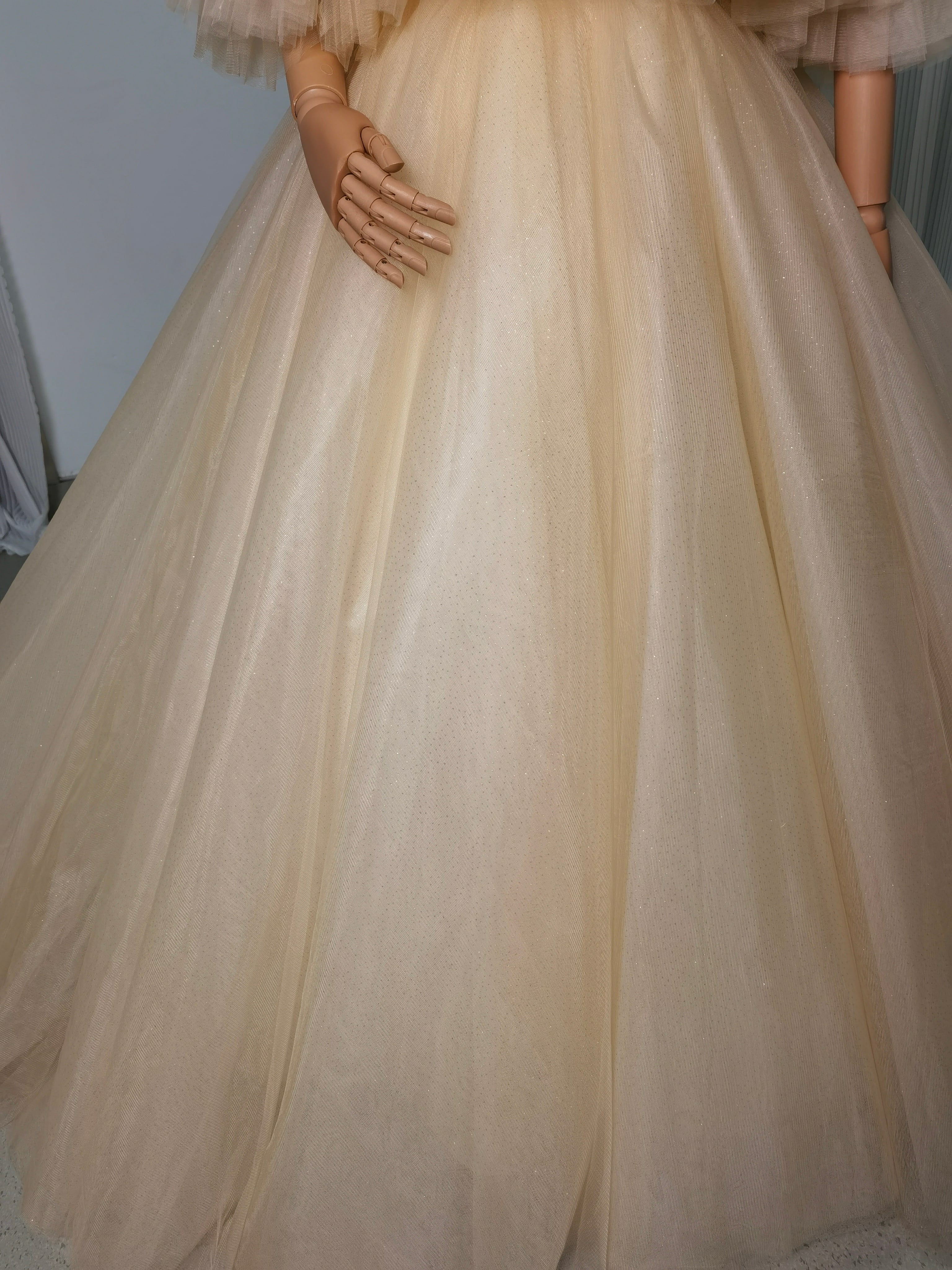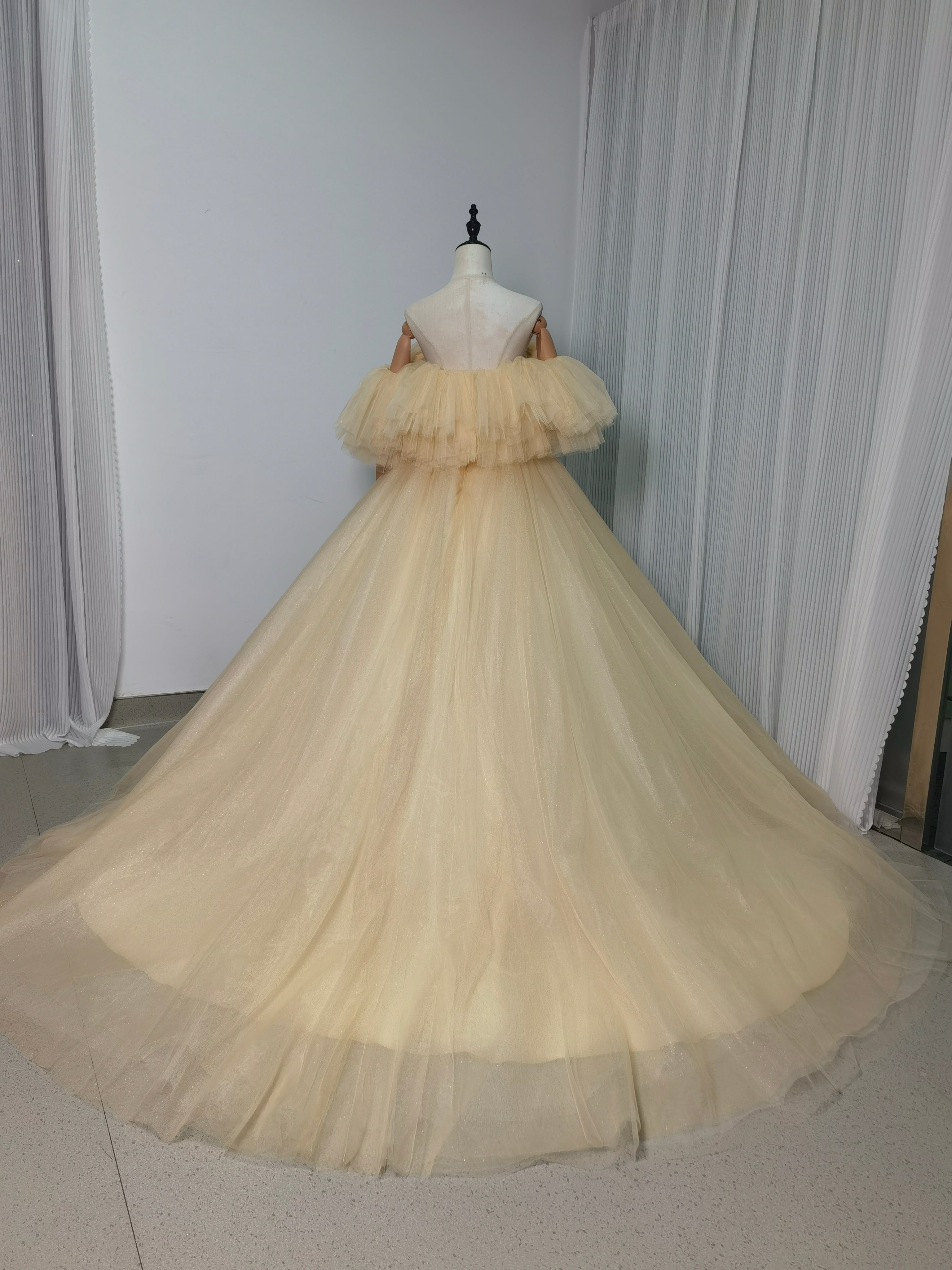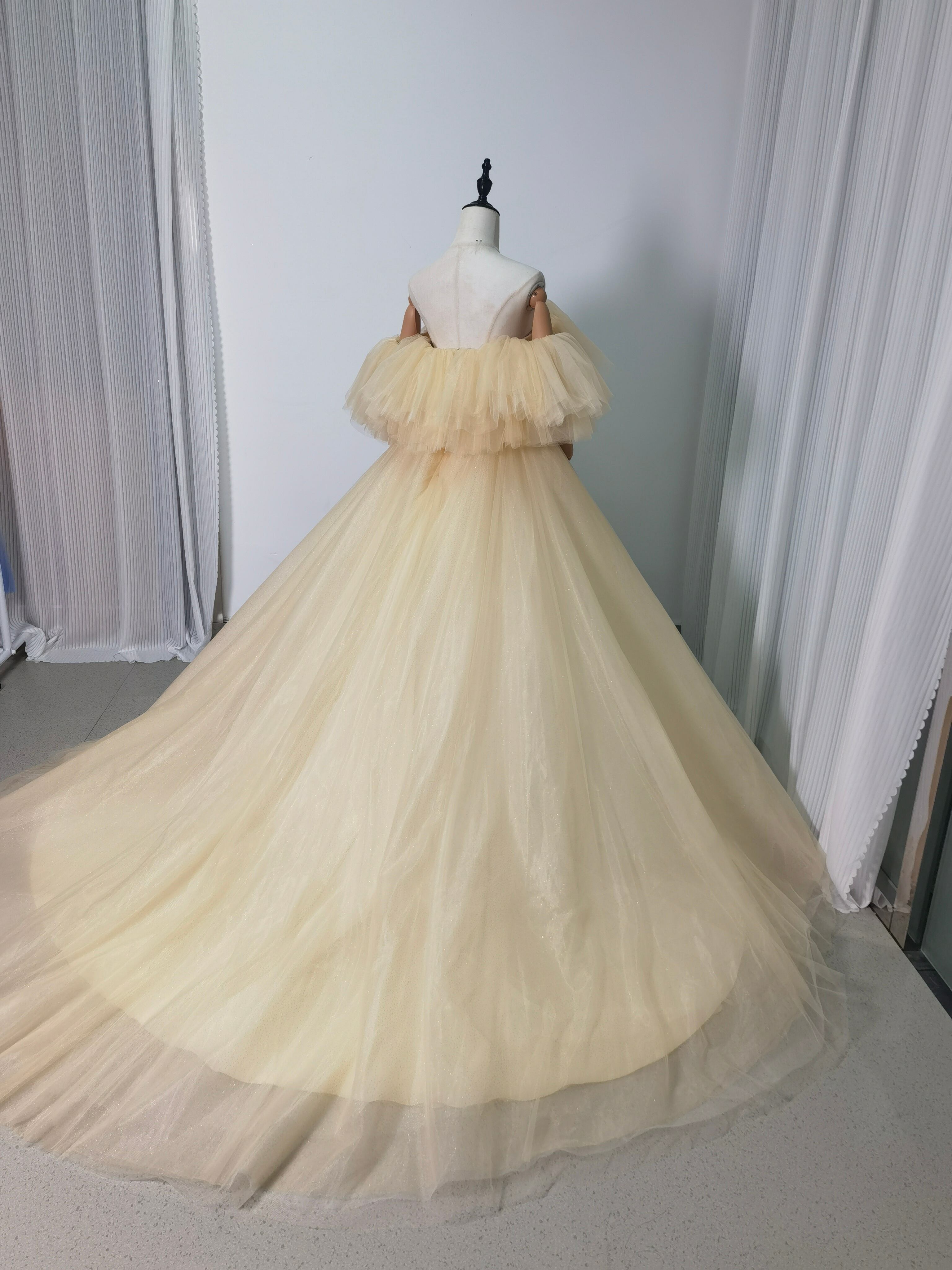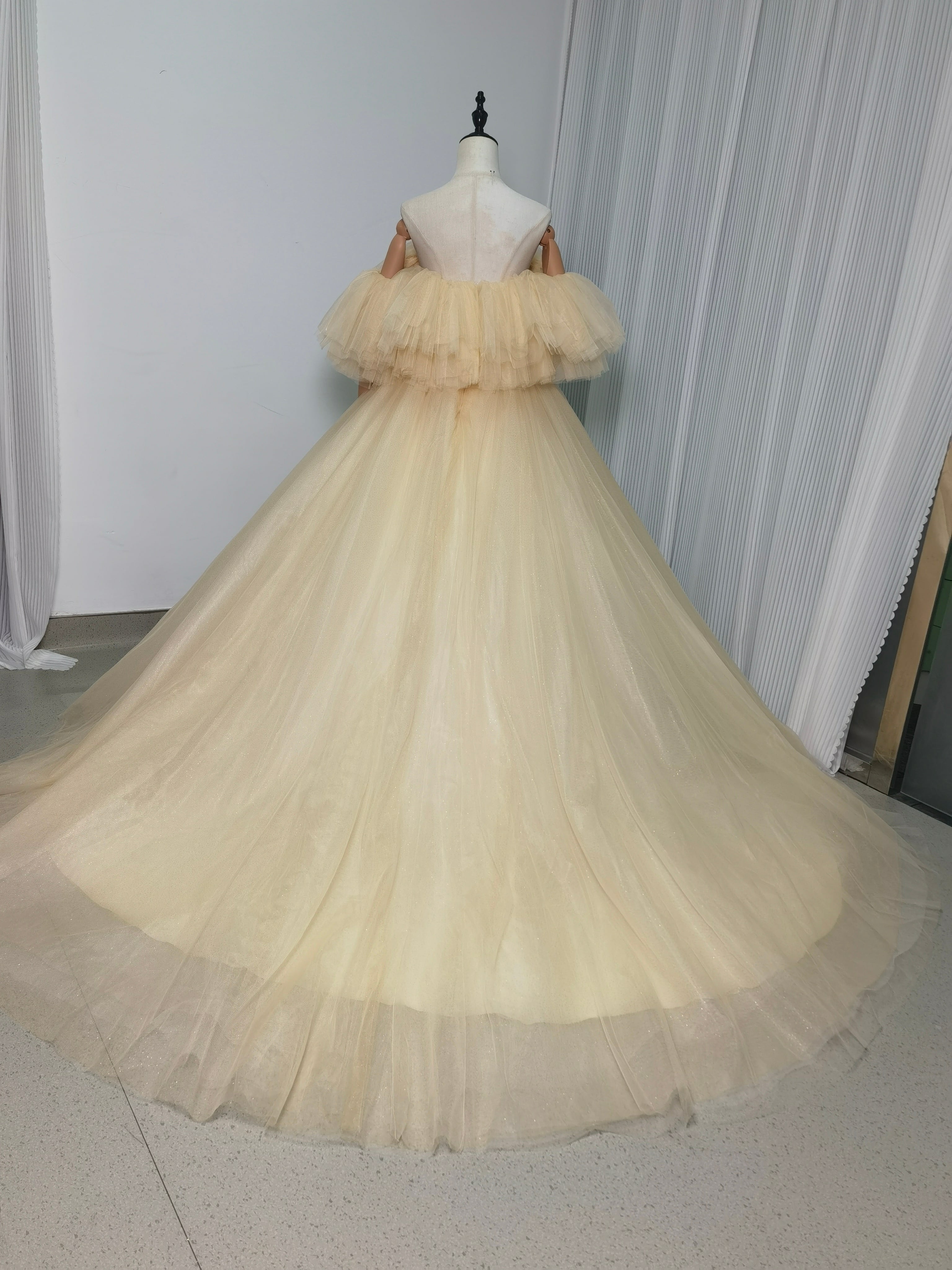 高品質!ラッフルケープのオフショルダーシャンパンベージュ カラードレス 華やかなトレーン チュールドレス 披露宴/拳式