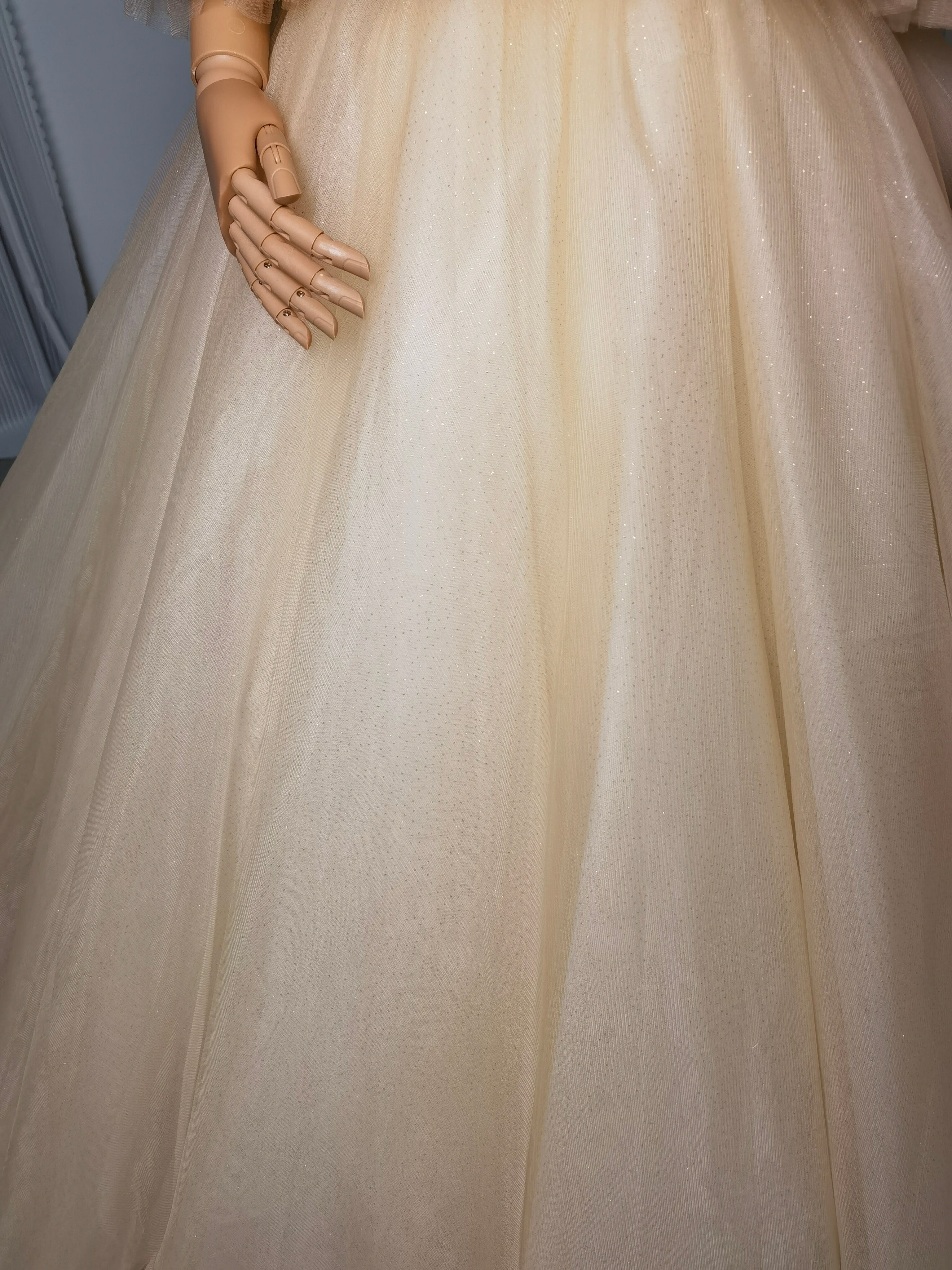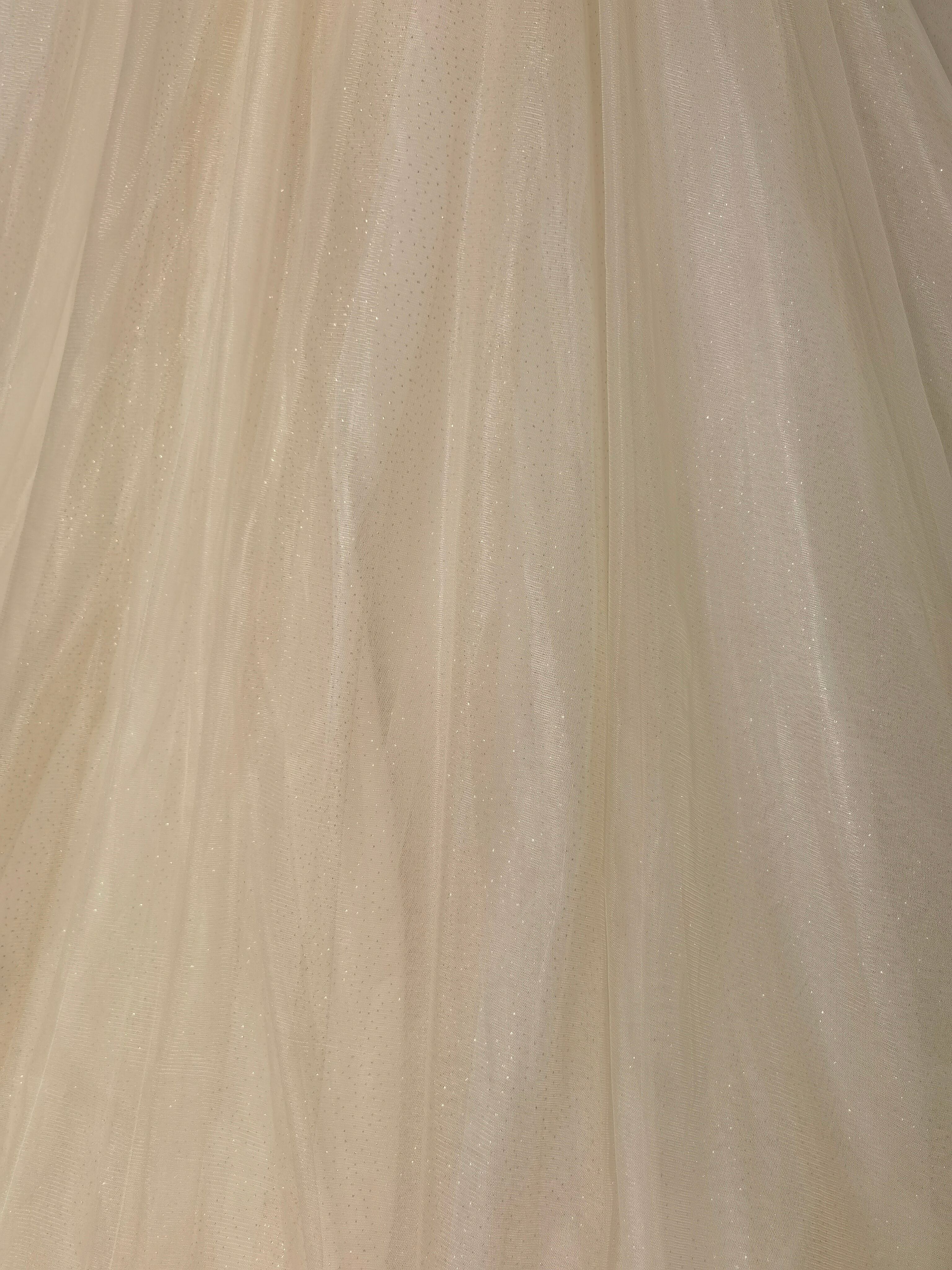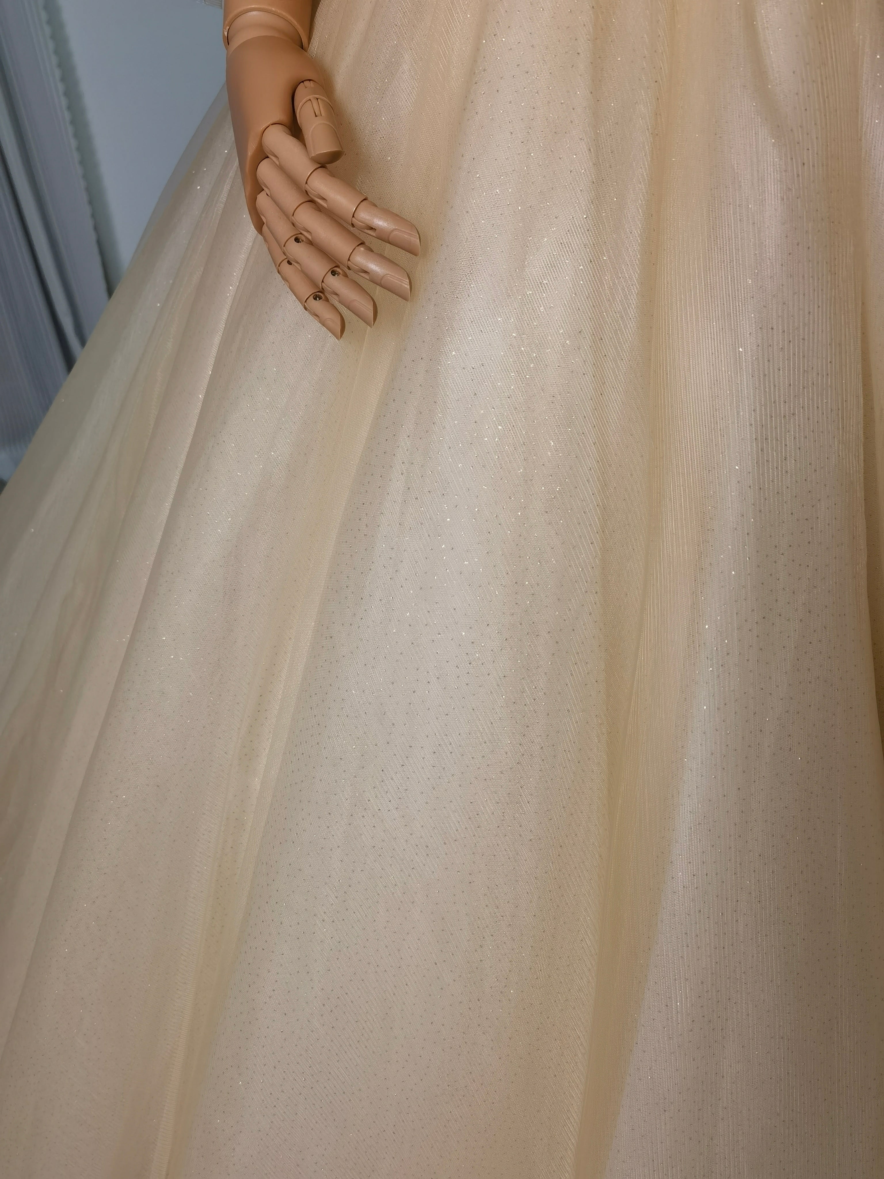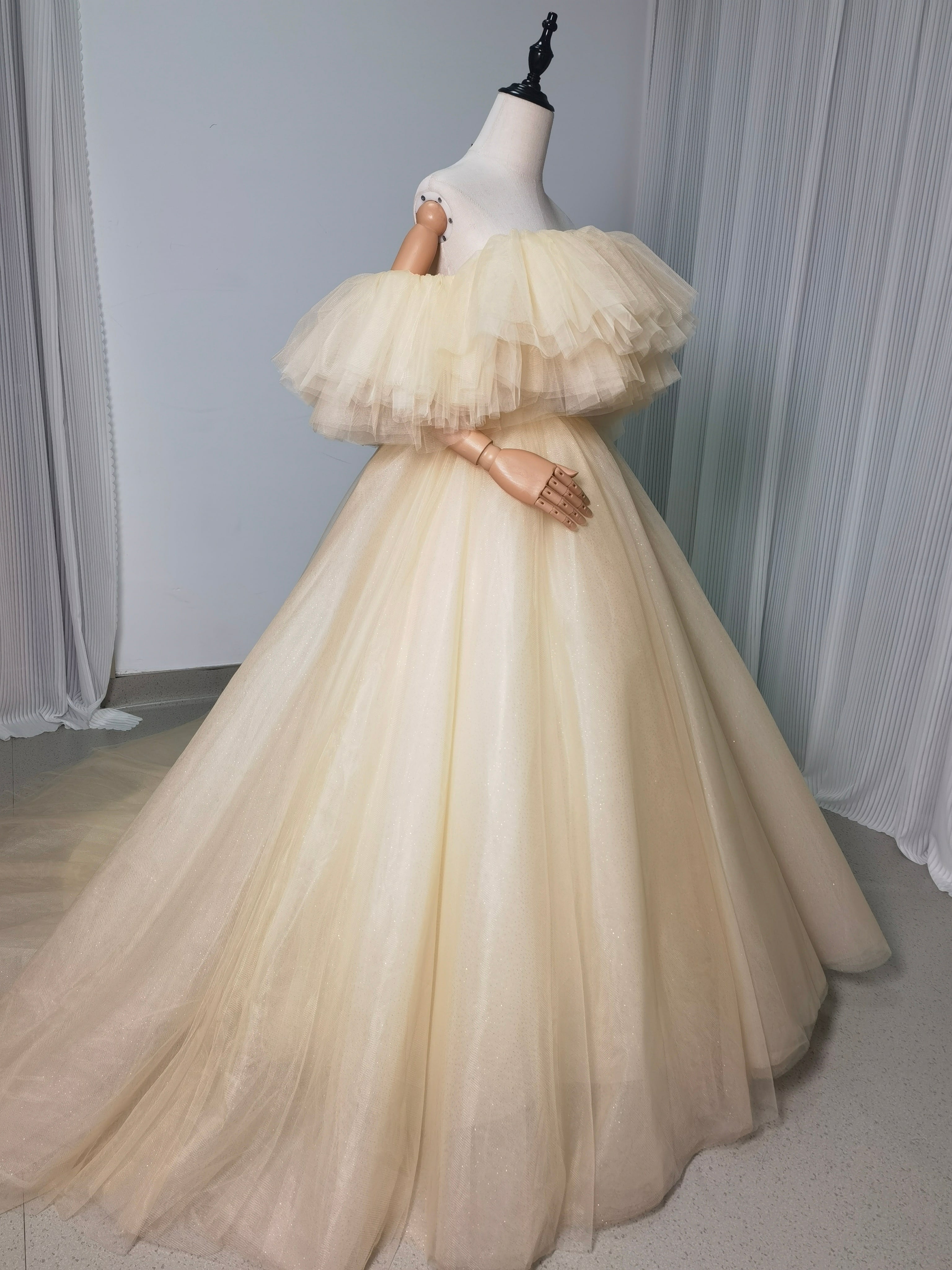 高品質!ラッフルケープのオフショルダーシャンパンベージュ カラードレス 華やかなトレーン チュールドレス 披露宴/拳式