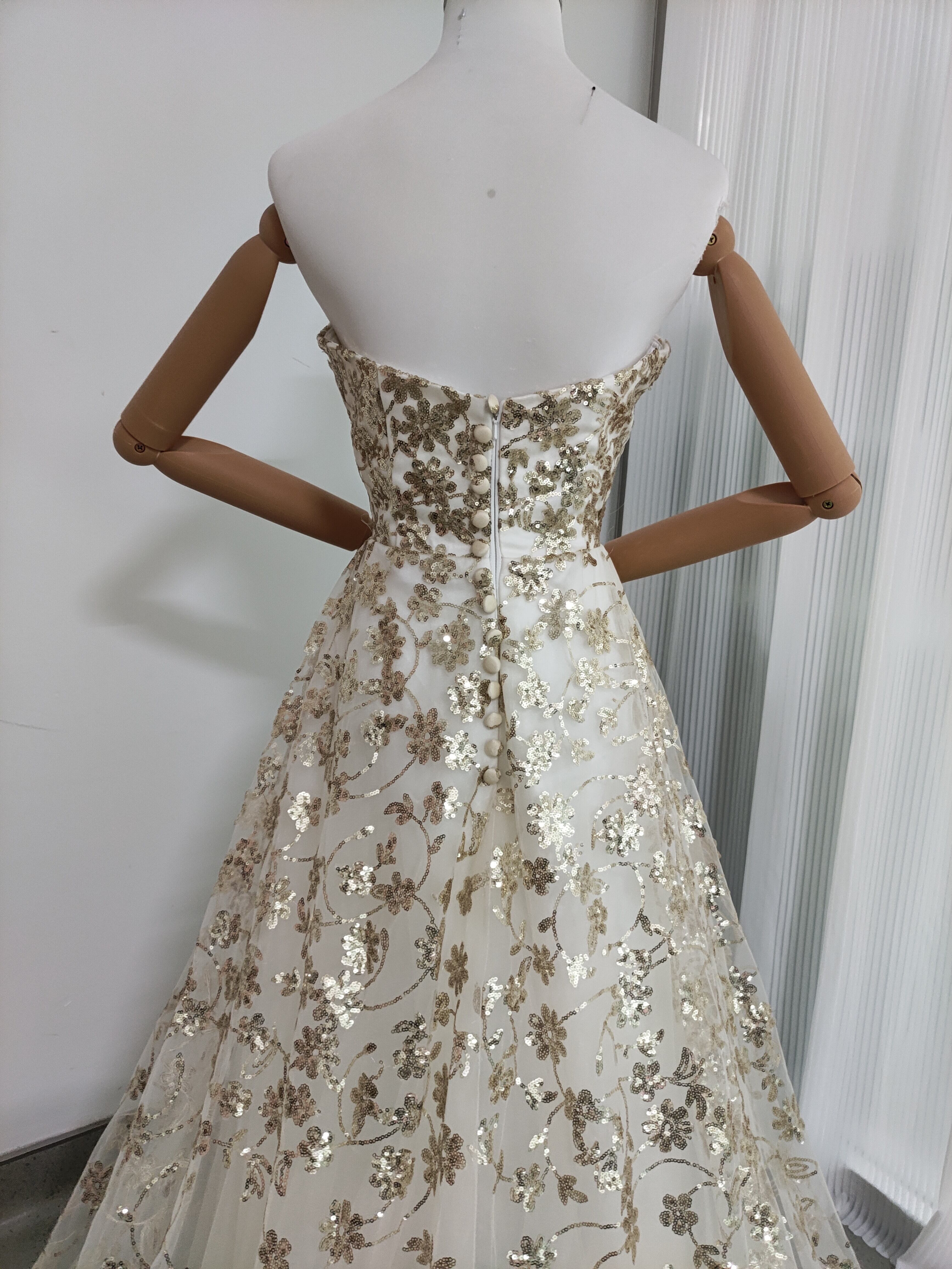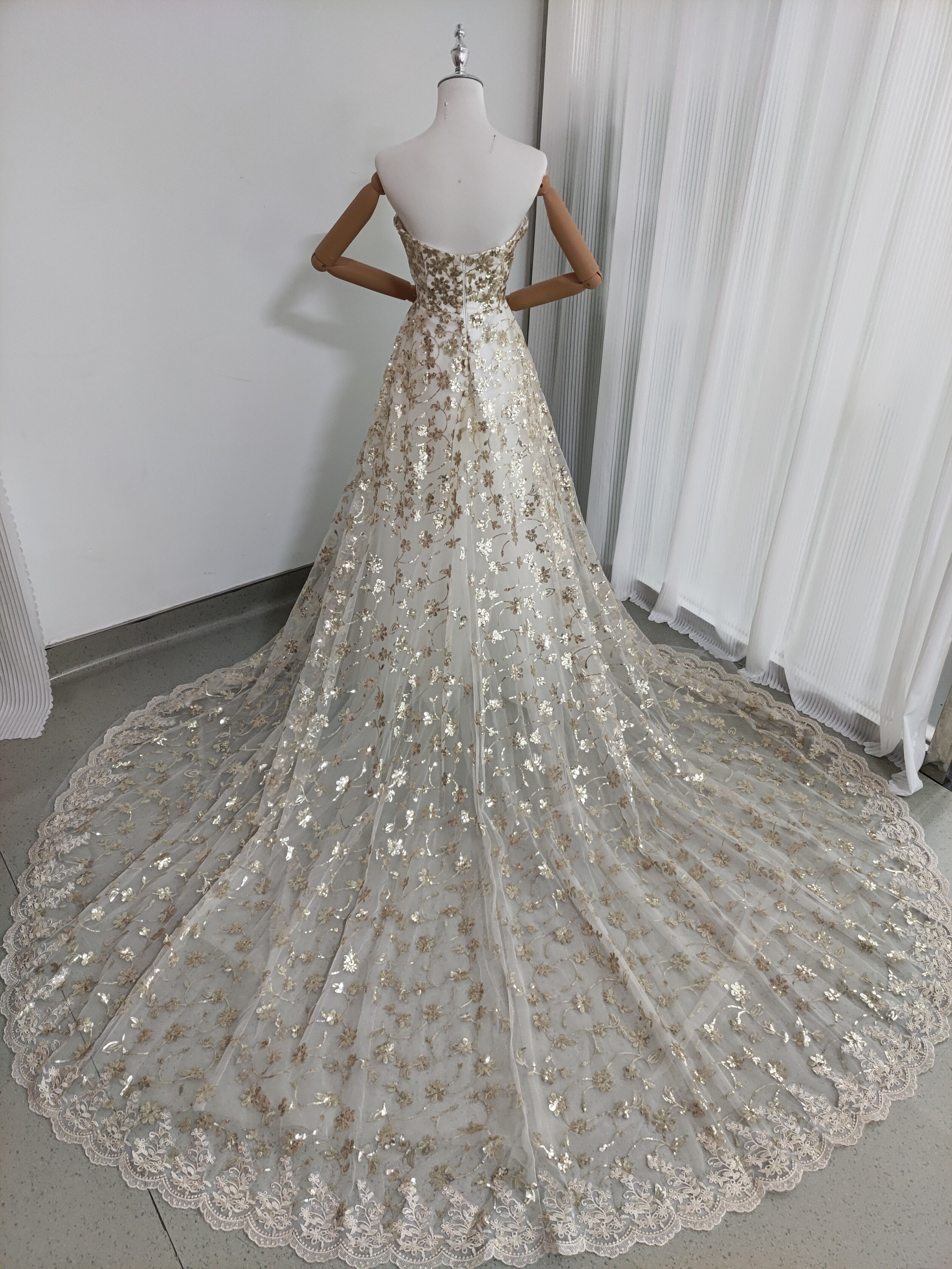 送料無料!キラキラゴールドの刺繍ドレス ビスチェ トレーン ハートカット