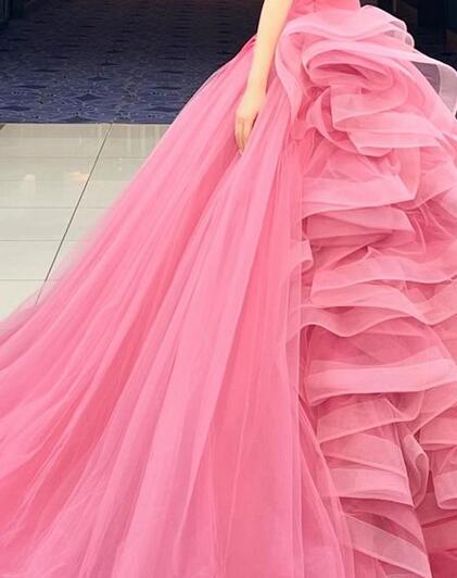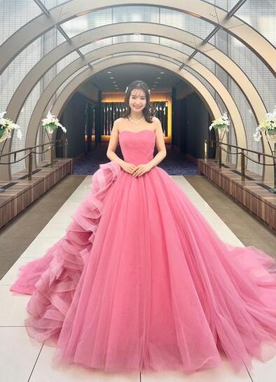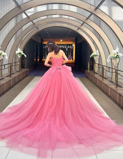 送料無料! カラードレス ピンク ソフトチュール ラッフルフリル 華やかなトレーン 結婚式
