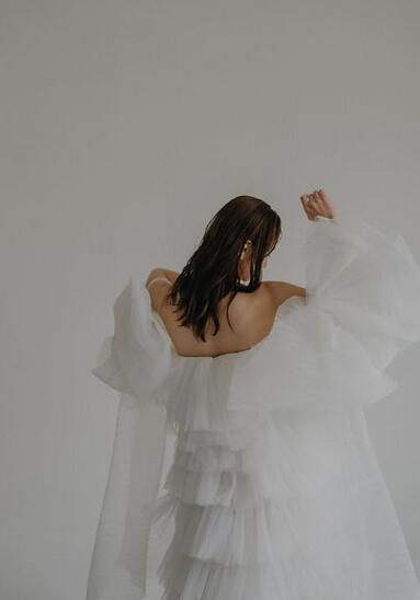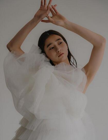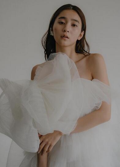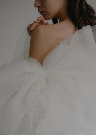 大好評中!チュールドレス ふわふわ袖 ベアトップ 結婚式披露 柔らかく重ねたチュール リボン