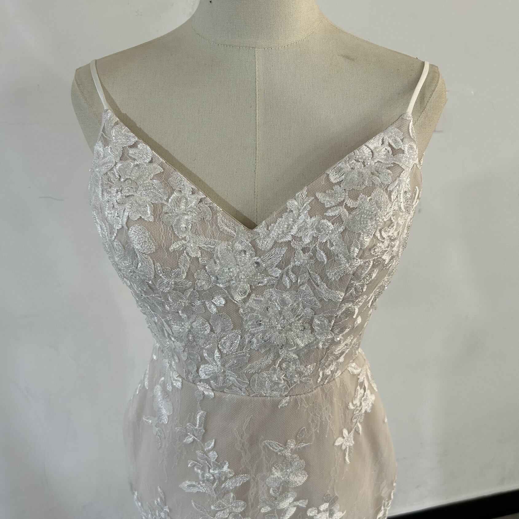 送料無料!シャンパン色 ウェディングドレス 花柄3D立体レース刺繍 Vネック 2次会