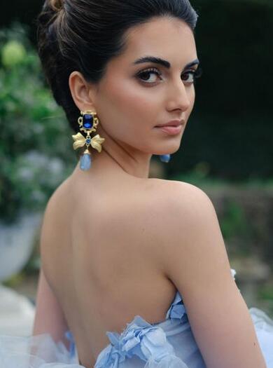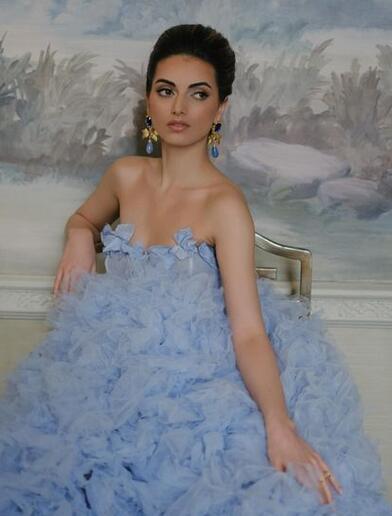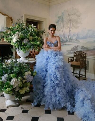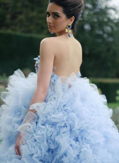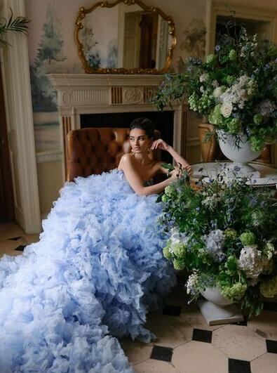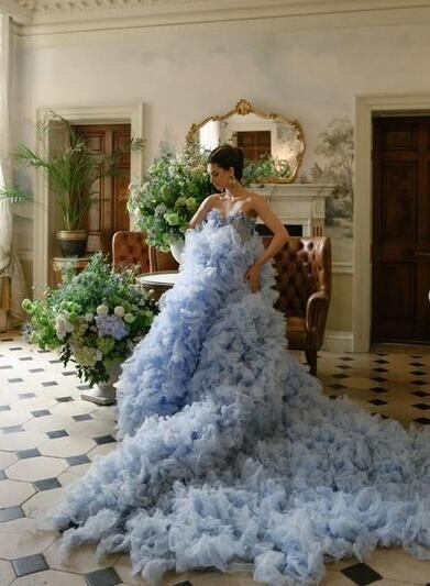 豪華!カラードレス 華やかなトレーン 爽やかで優しいブルー 柔らかく重ねたチュールスカート
