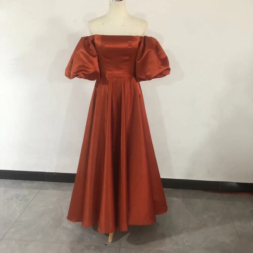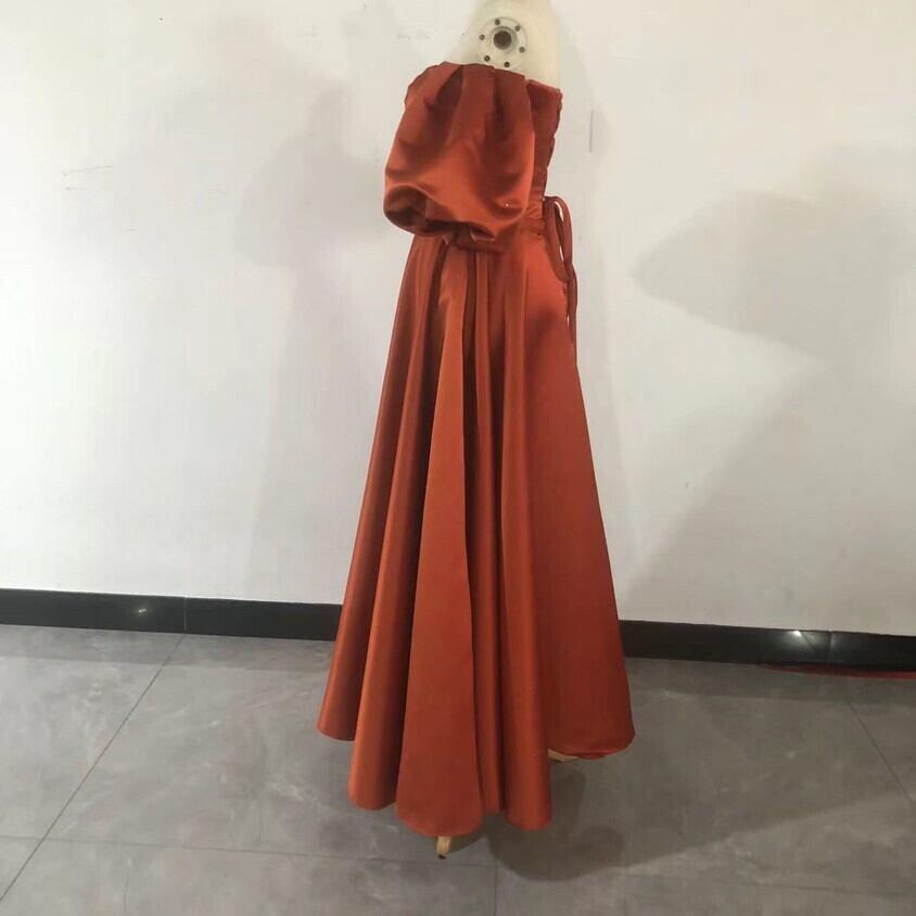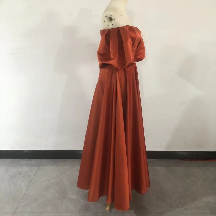 高品質!パーティードレス 前撮り結婚式 2次会 オレンジ ビスチェ オフショルのパフス 床付くリーブ