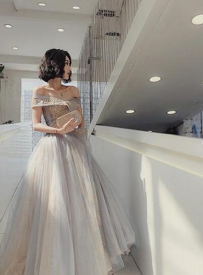 高品質!カラードレス オフシェル ソフトチュール アンティーク色 編み上げ 結婚式/披露宴/パーティー