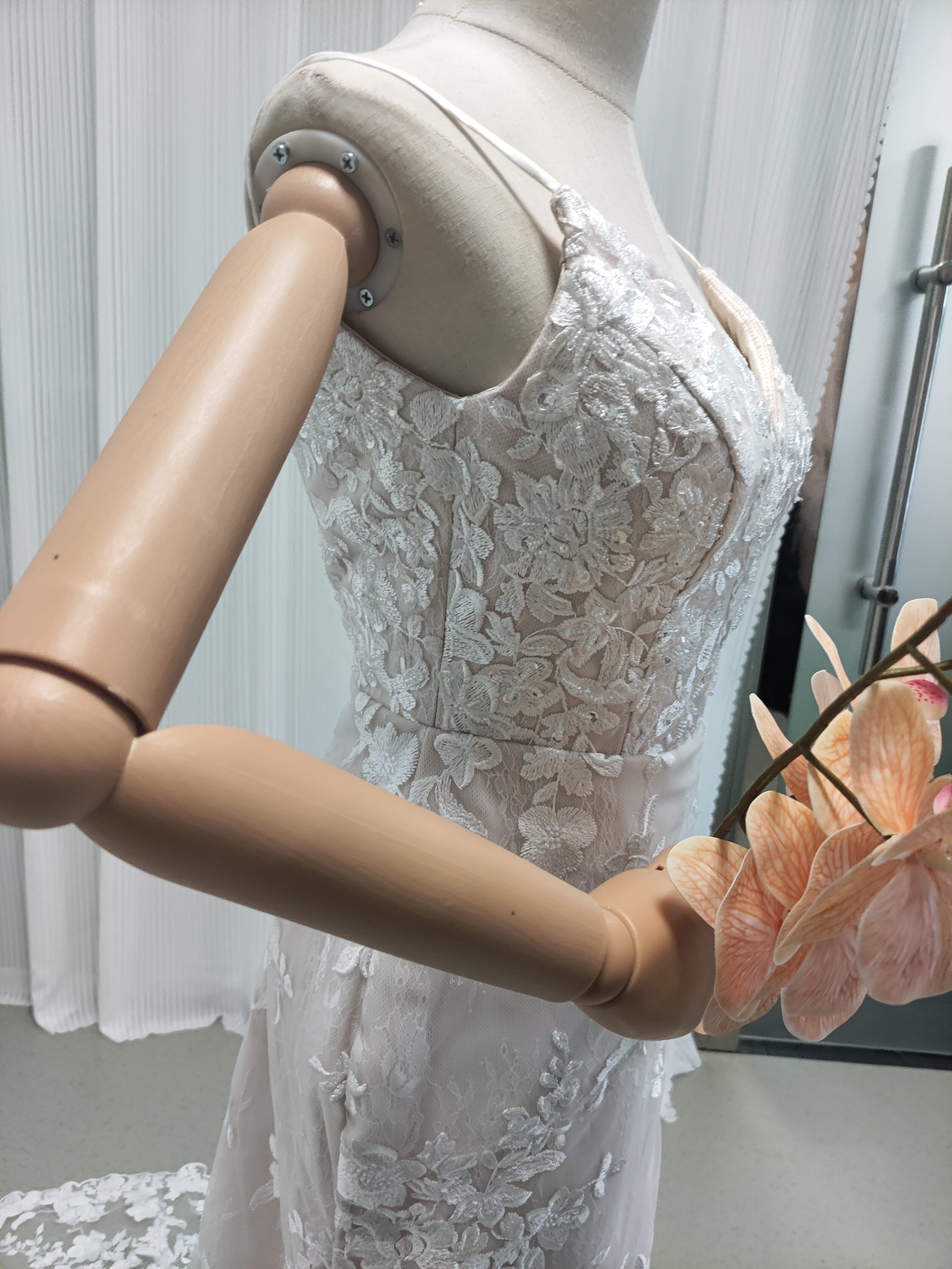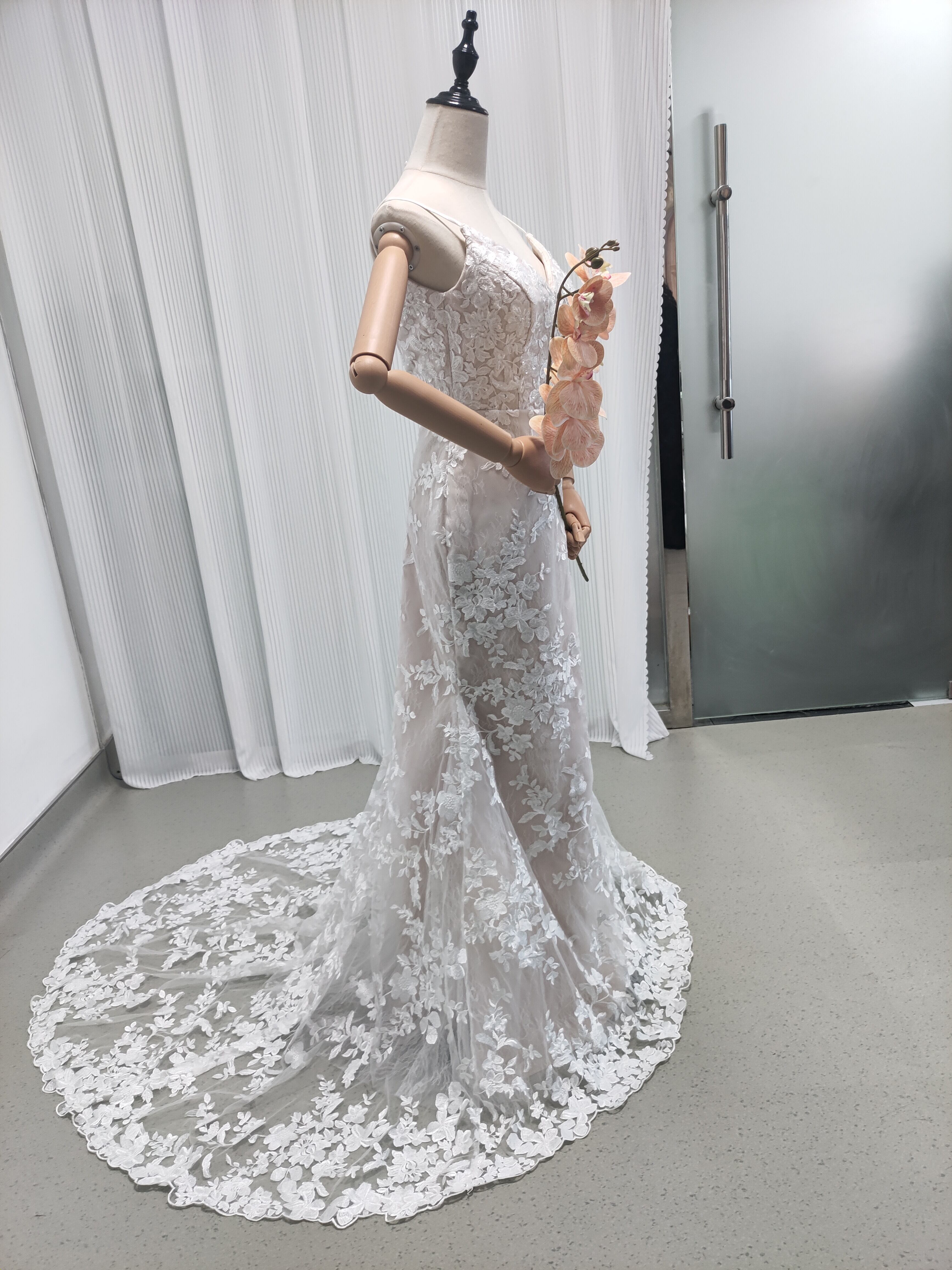 送料無料!シャンパン色 ウェディングドレス 花柄3D立体レース刺繍 Vネック 2次会