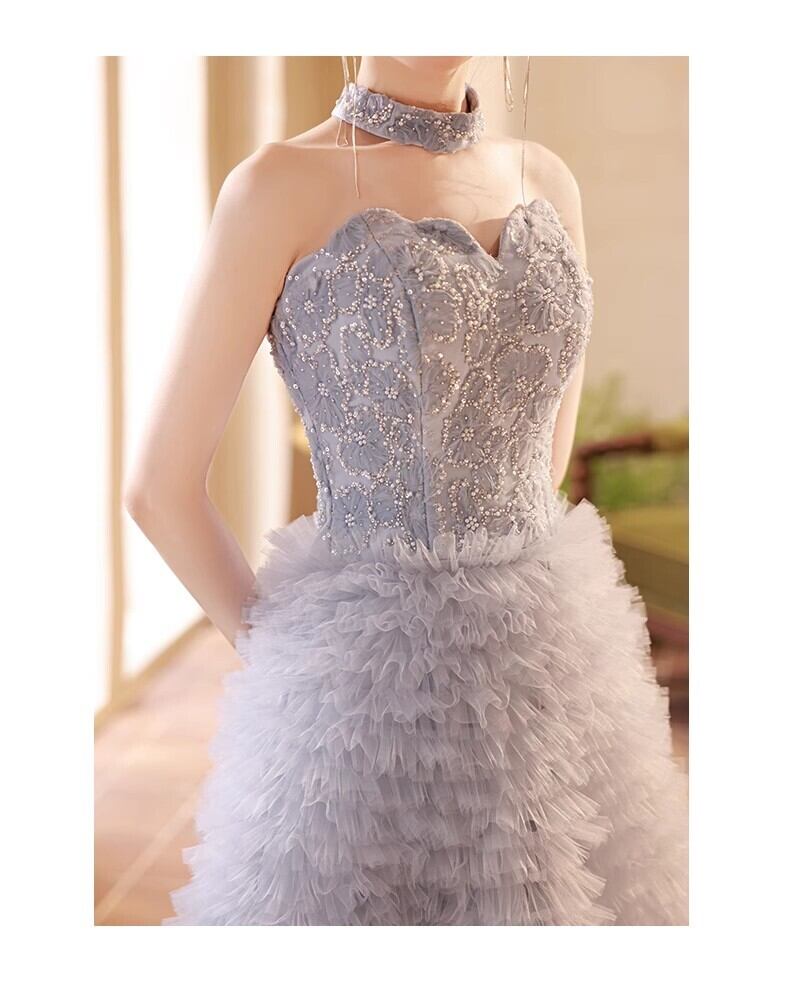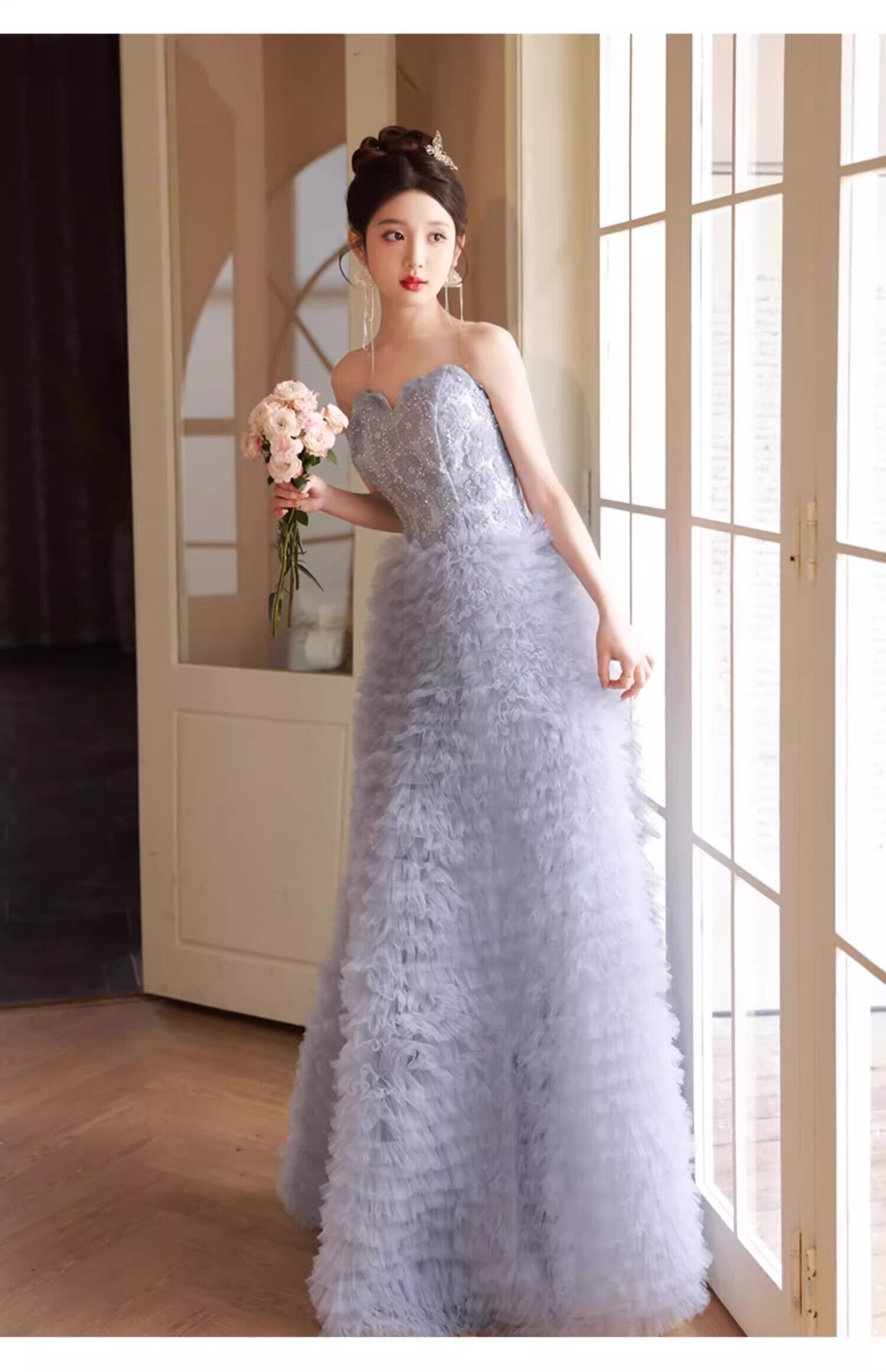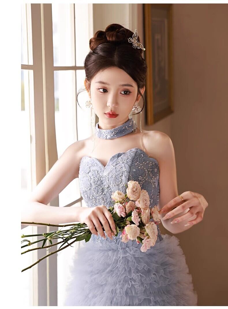 送料無料!美品!ブルーグレー カラードレス ソフトチュール 重ねたチュールスカート/前撮り/結婚式