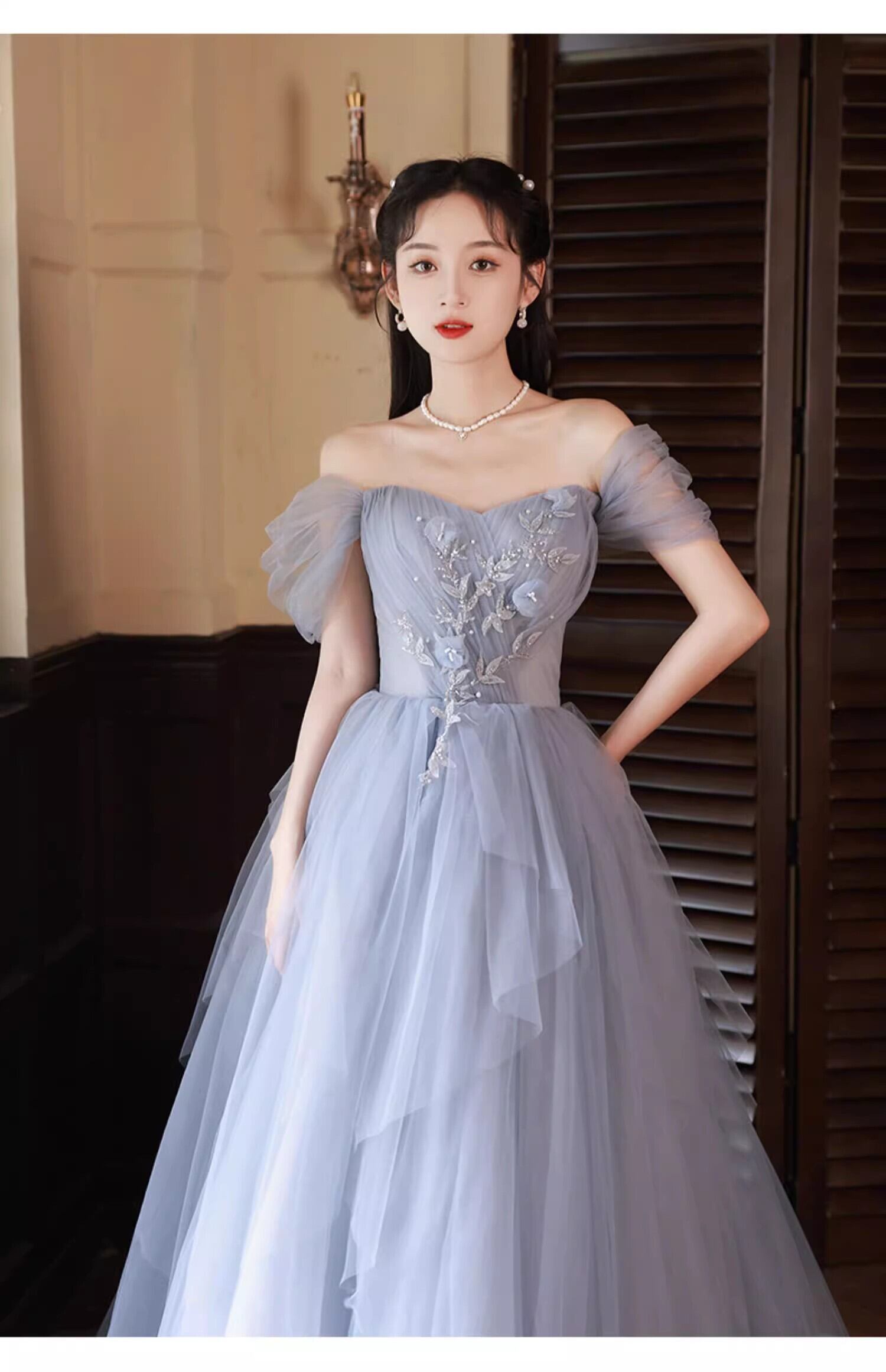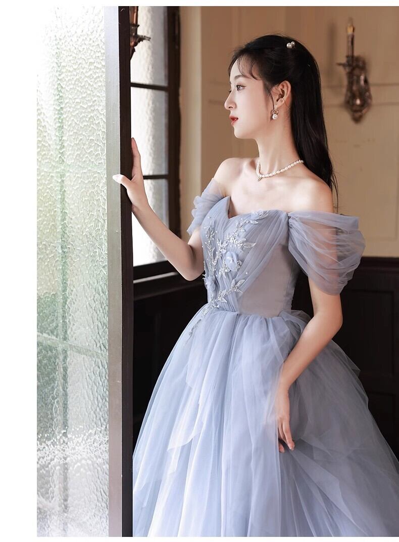 オフショルダー ブルーグレー カラードレス 柔らかいチュールスカート ノ演奏会/音楽会