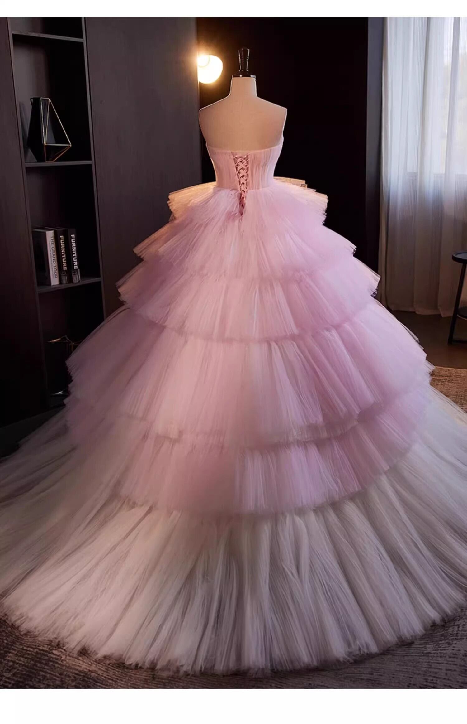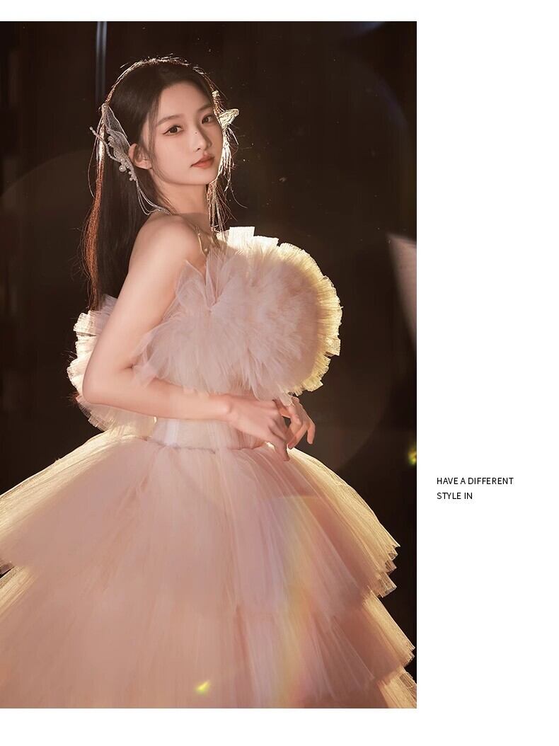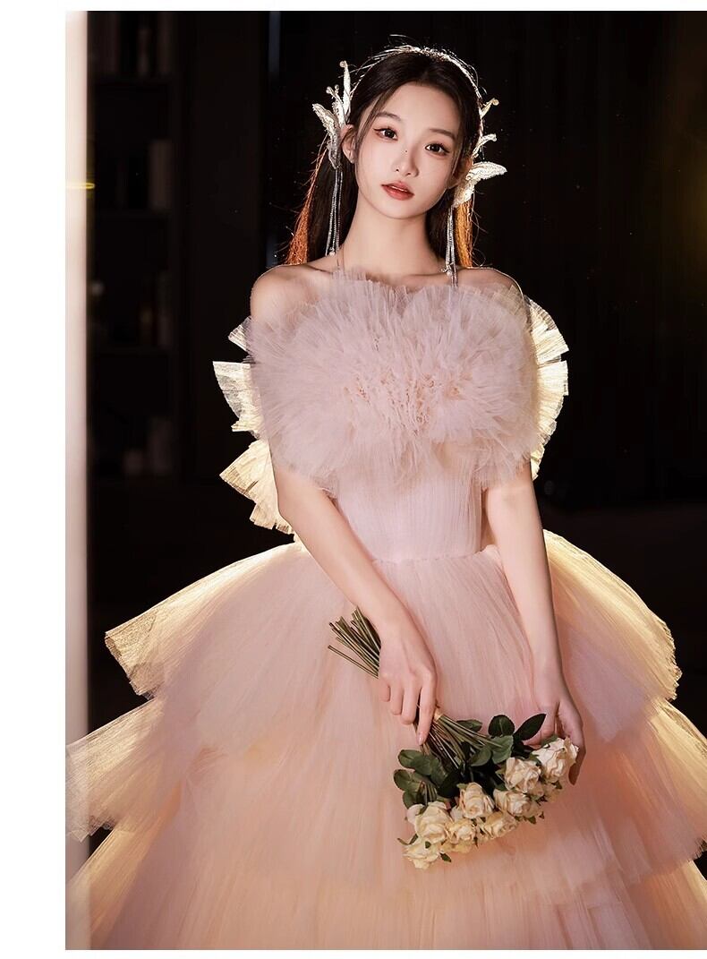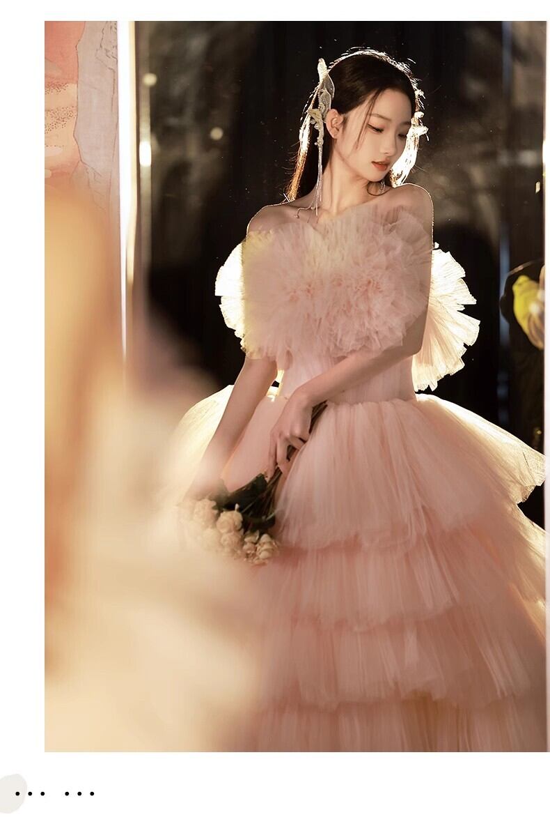 送料無料!美品! ピンクカラードレス ソフトチュール 重ねたチュールスカートもこもこドレス ふわふわドレス/前撮り/結婚式