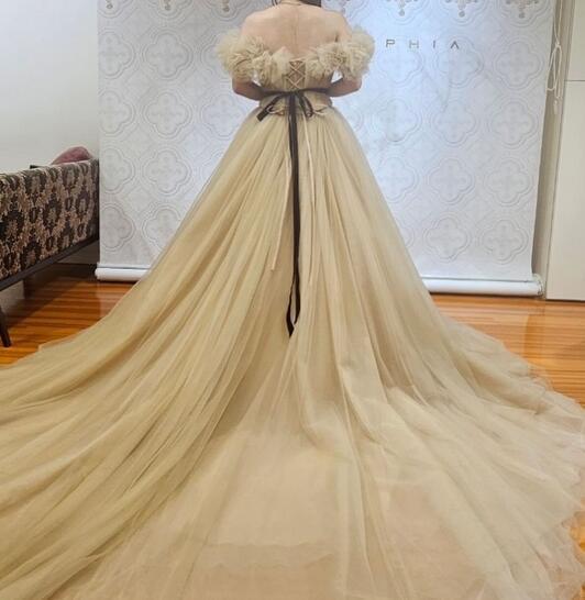 カラードレス 取り外しオフショルダー 柔らかいチュール ファスナーと引っ掛けるタイプの編み上げ イエロー/黄色い 披露宴/音楽会/発表会/教会式/人前式 | David1021k Dress(ダヴィドレス)