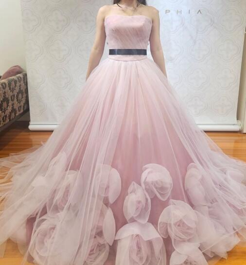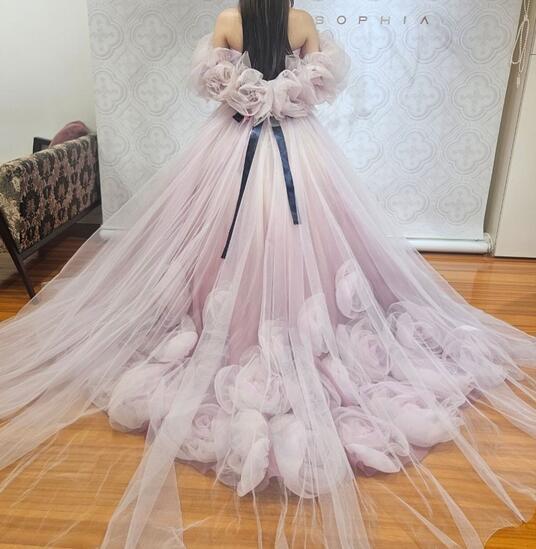 カラードレス 華やかな取り外しオフショルダー 柔らかいチュール 花型リボン ピンク 披露宴/音楽会