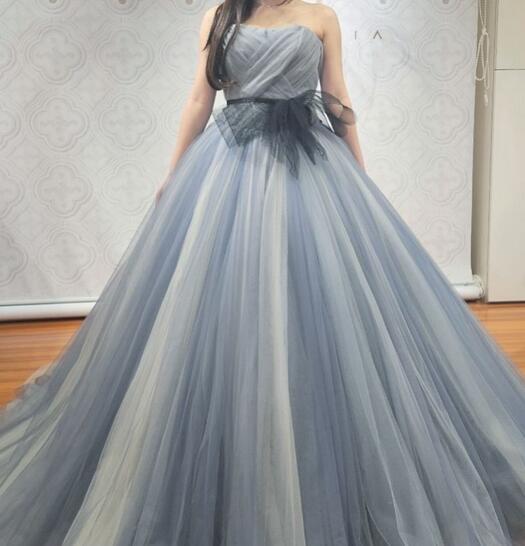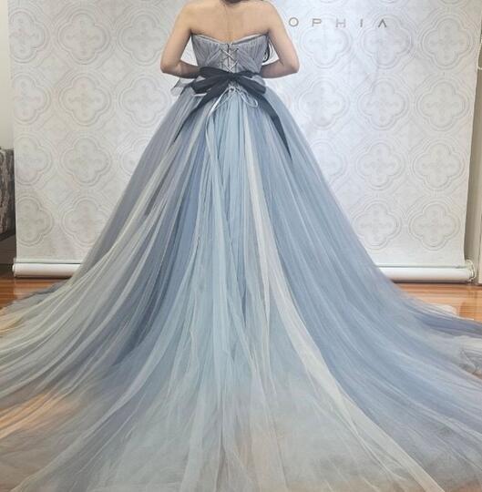 送料無料!カラードレス 柔らかく重ねたチュールドレス ノースリーブ トレーン 編み上げ 披露宴/音楽会