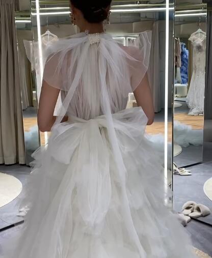 豪華!パーティードレス ソフトチュール 白い/ホワイト 重ねたチュール ラッフルフリル 華やかなトレーン 二次会/挙式/前撮り/結婚式