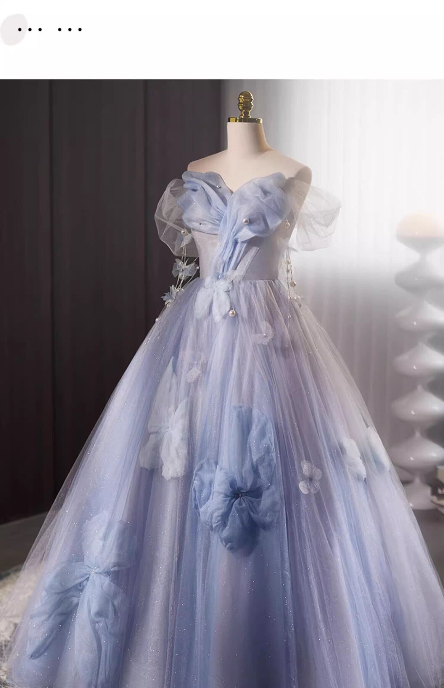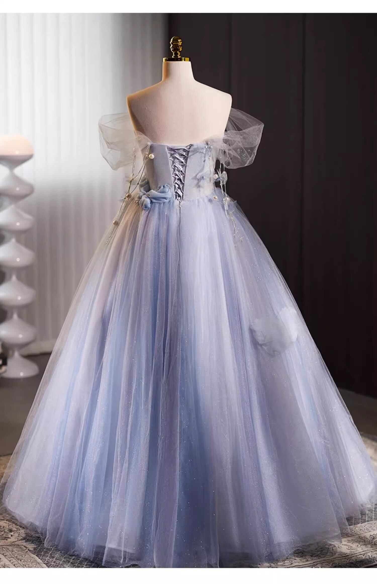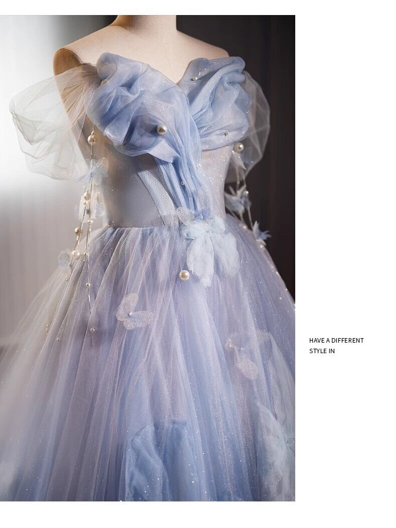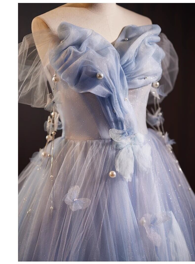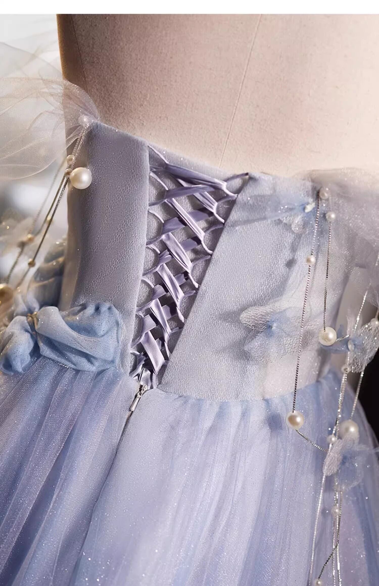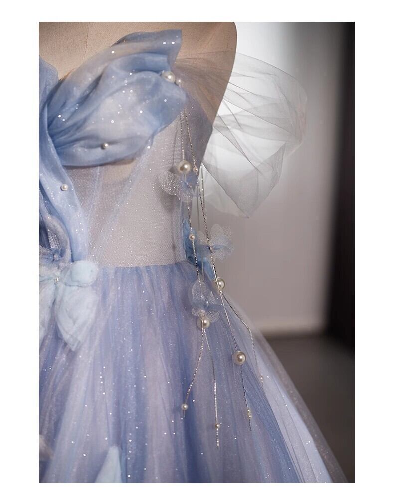 青のグラデーション カラードレス キラキラスパンコール 可愛い リボン パール 柔らかいチュールスカート ノ演奏会/音楽会