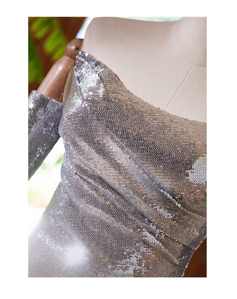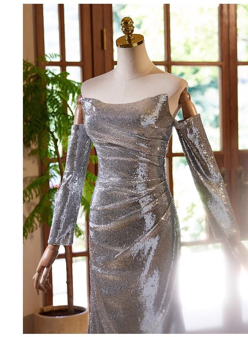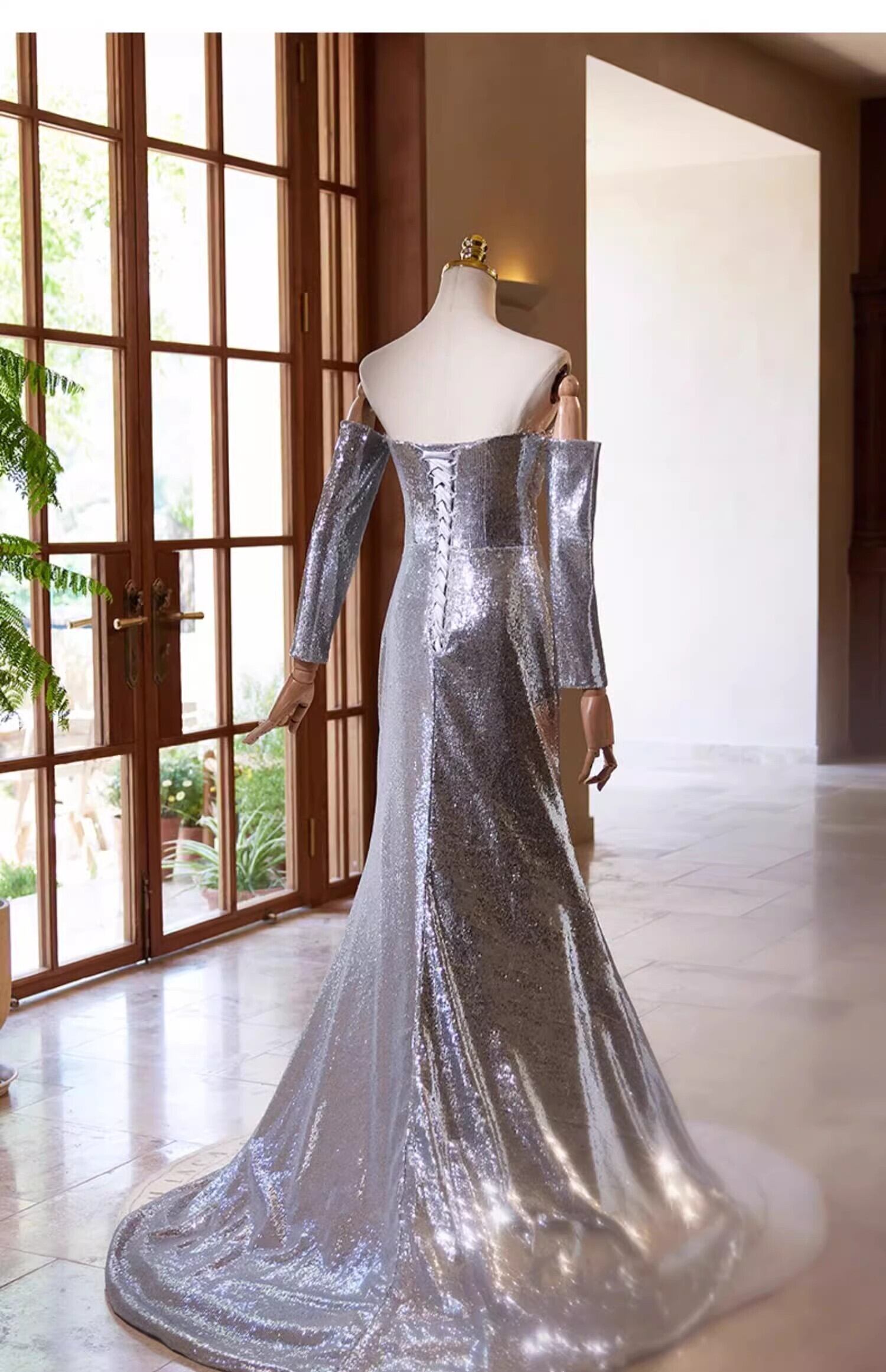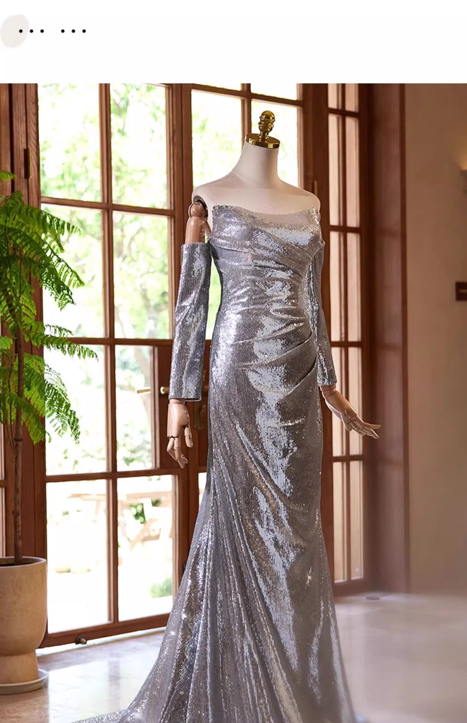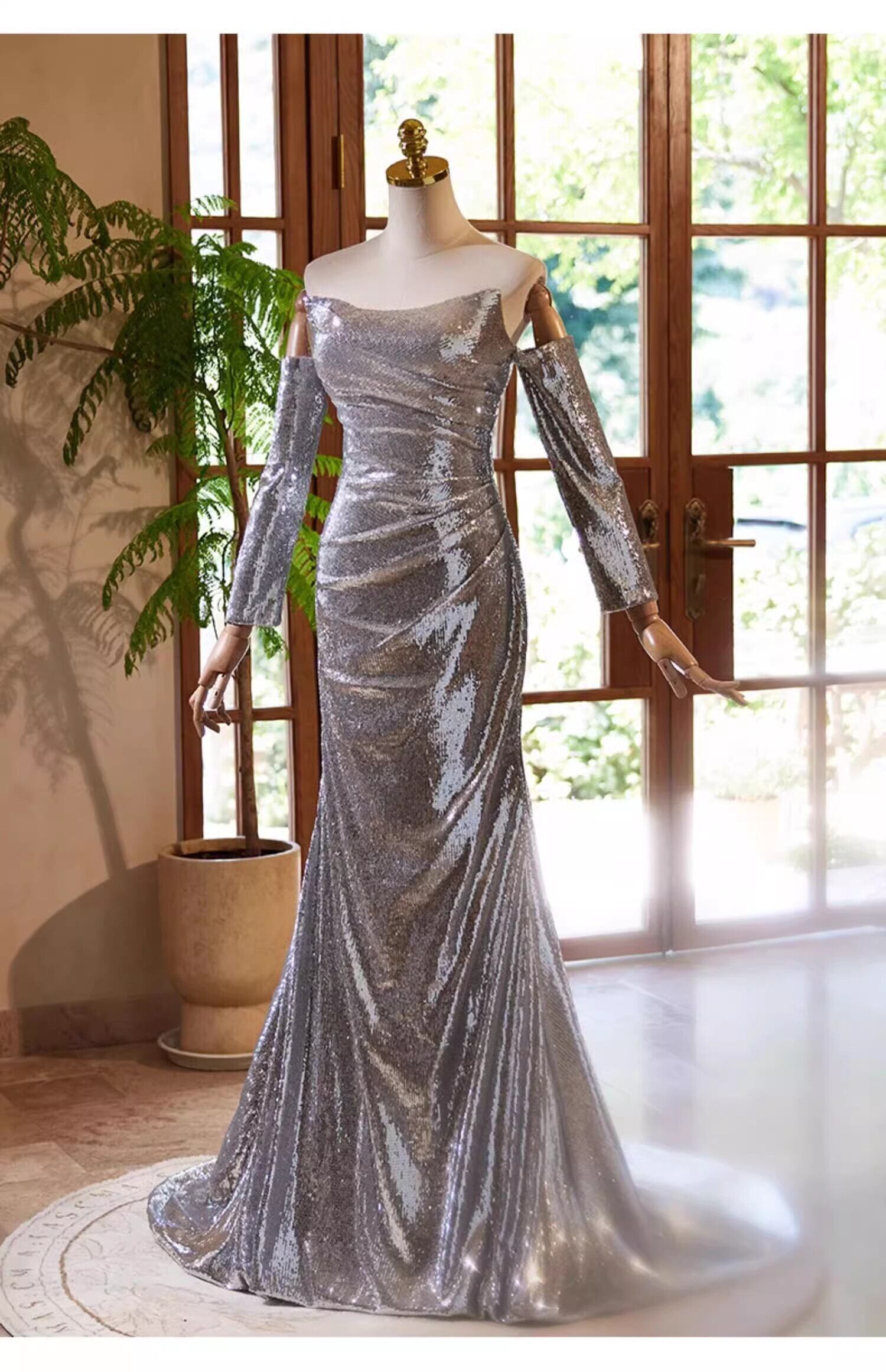 グレー カラードレス キラキラスパンコール チュールスカート 華やかなトレーン 演奏会/音楽会