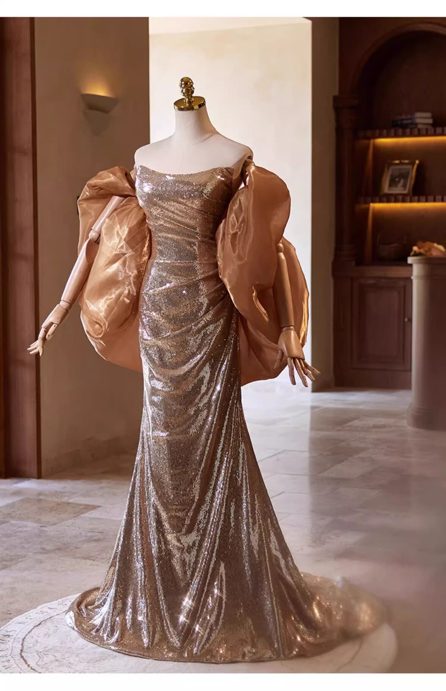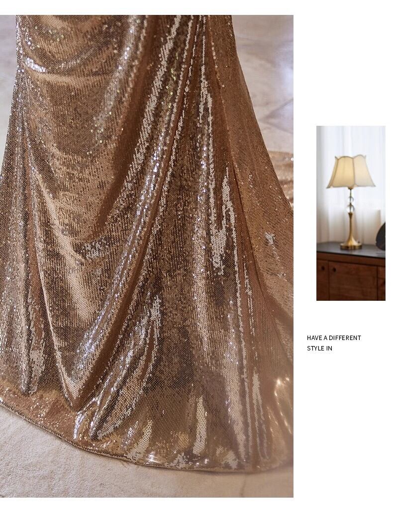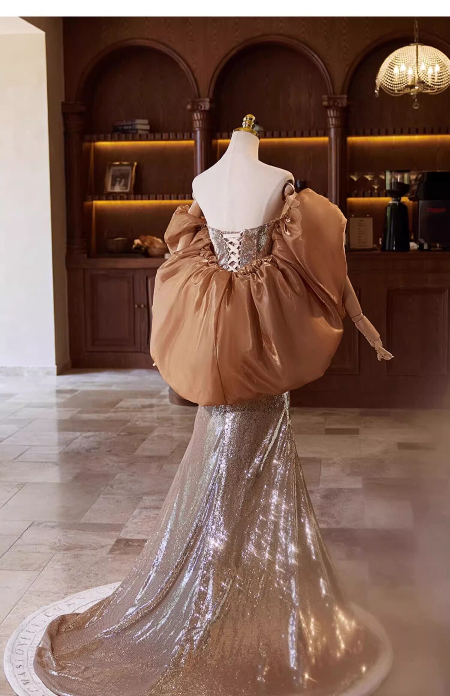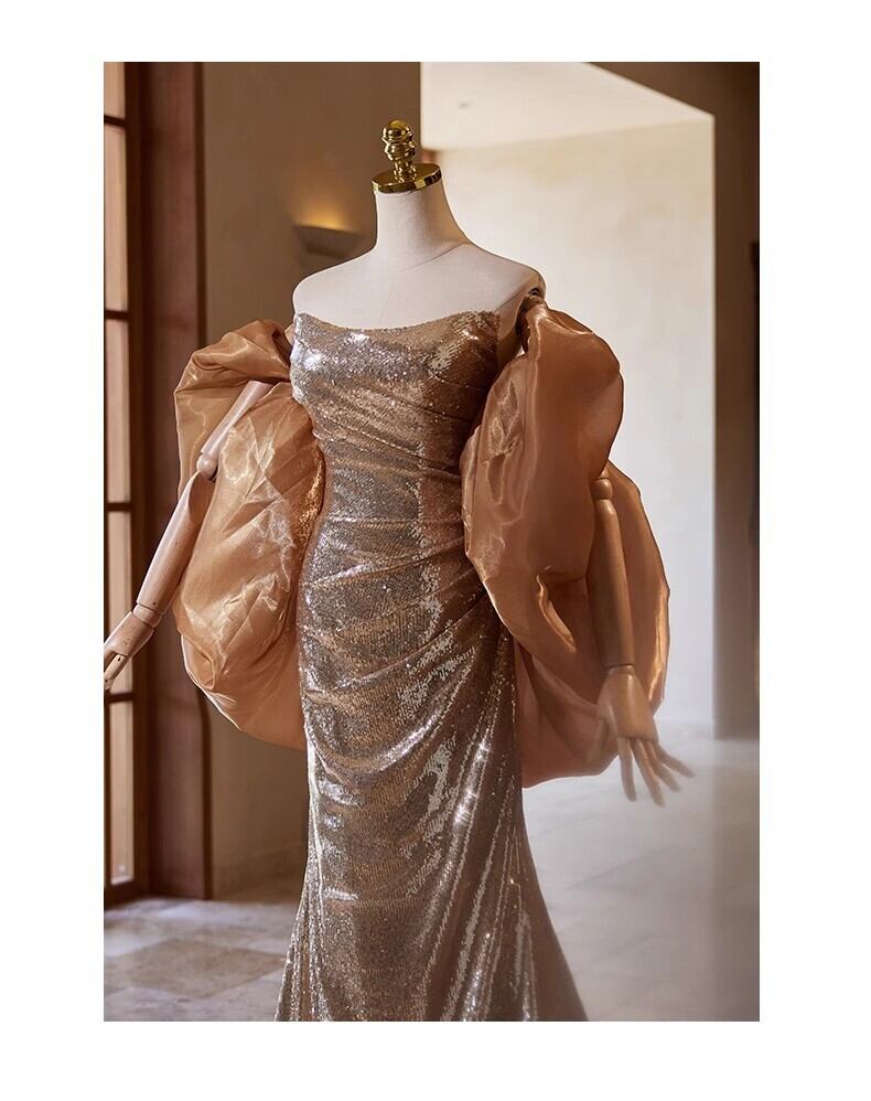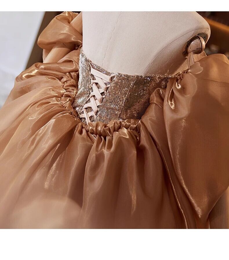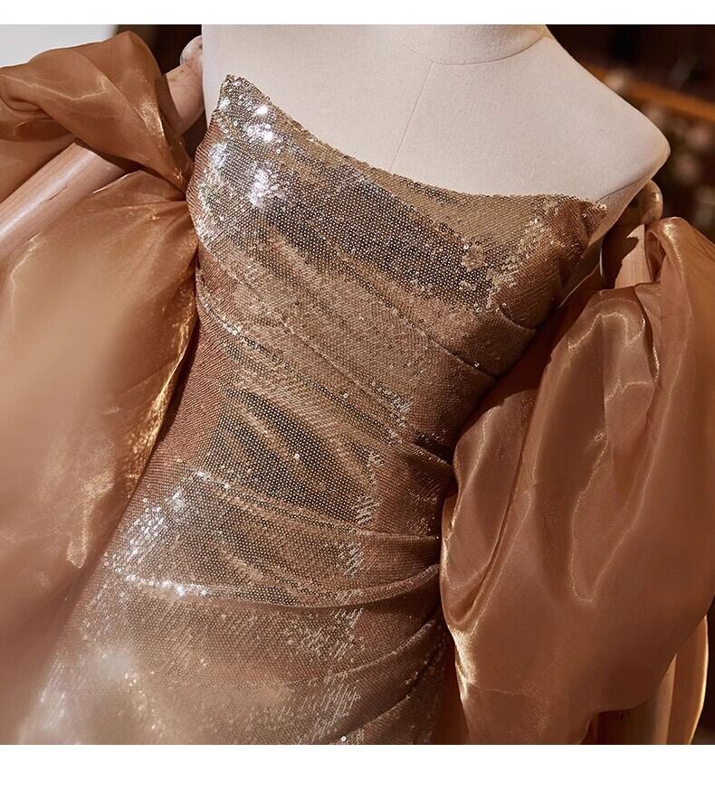 シャンパン色 カラードレス 姫袖 キラキラスパンコール チュールスカー マーメイドライン 演奏会/音楽会