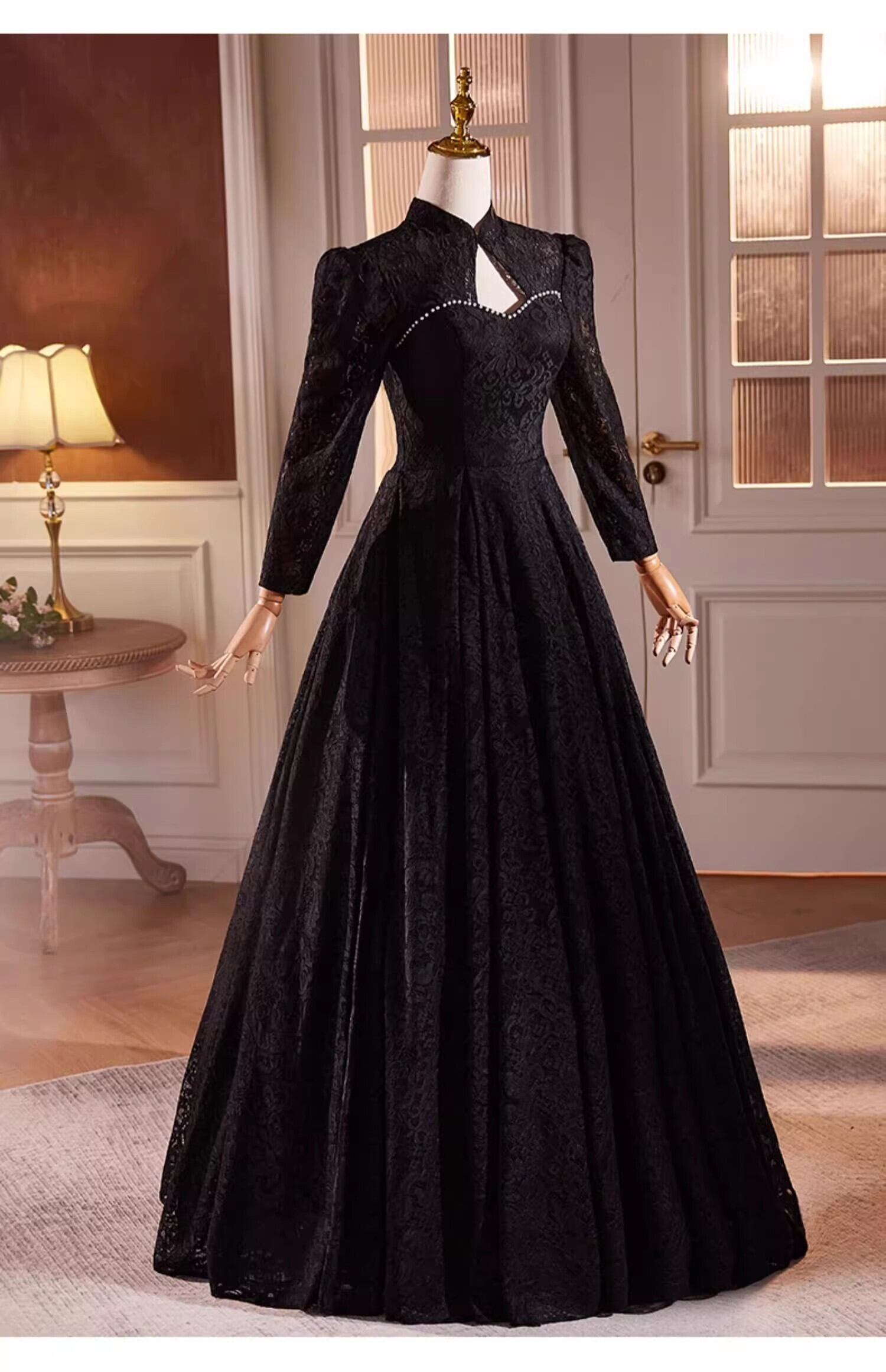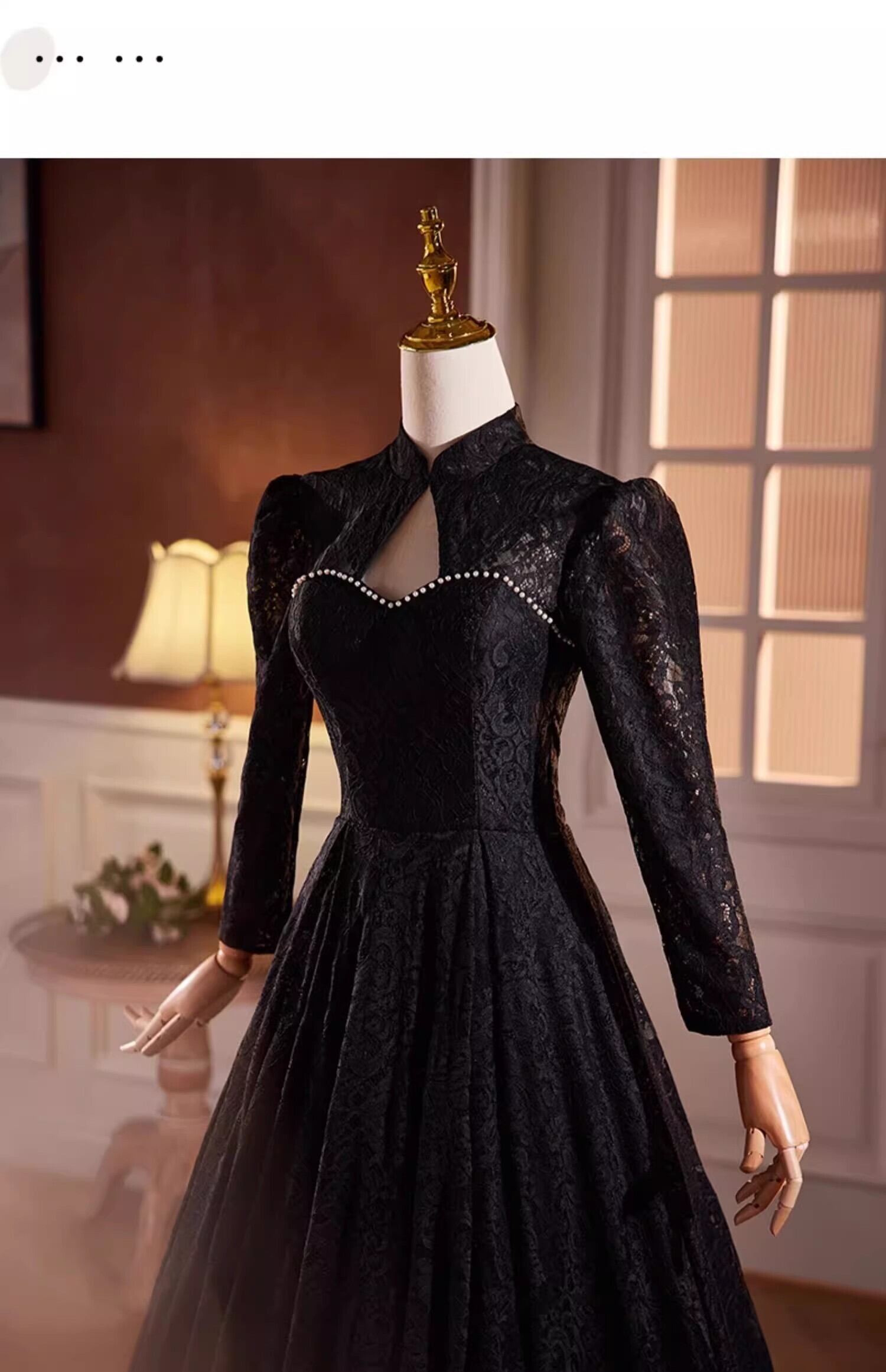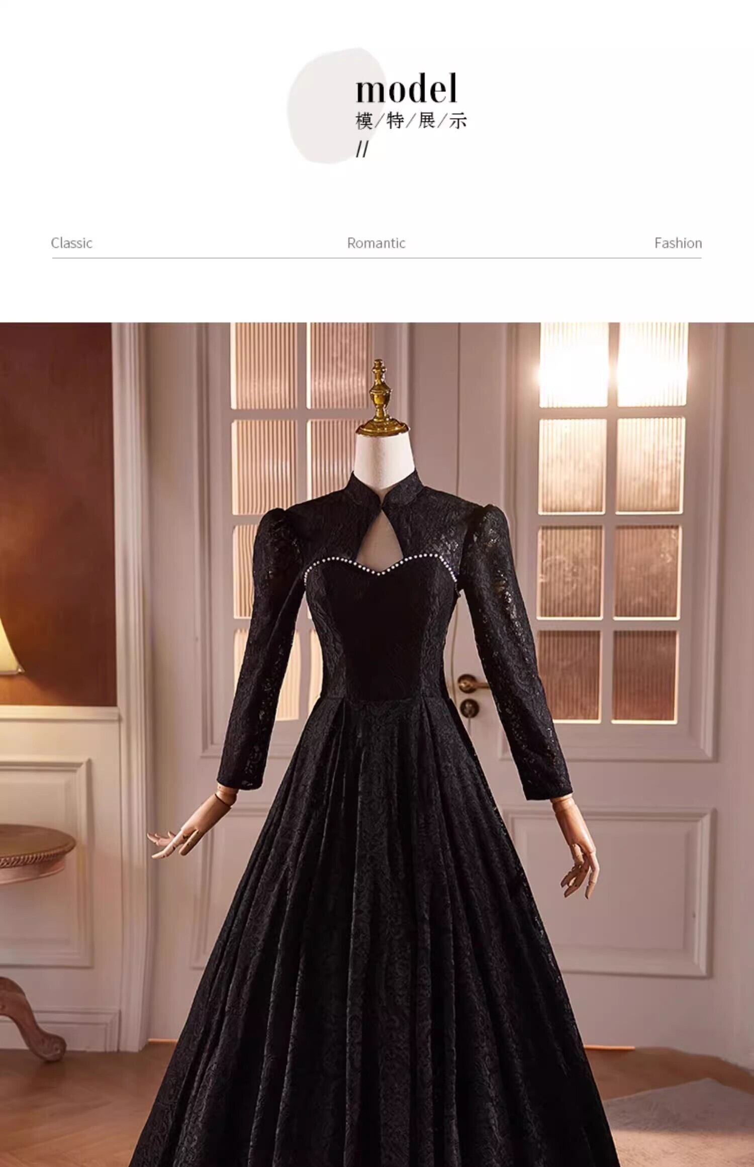 黒 カラードレス D立体レース刺繍 長袖 パーティードレス 演奏会/音楽会