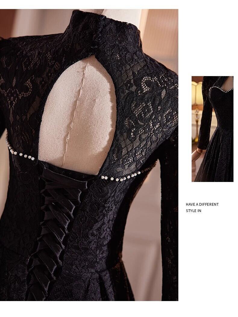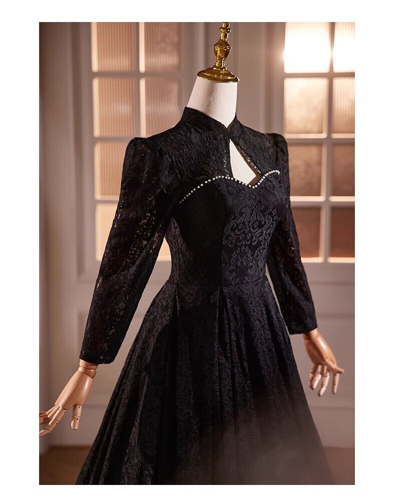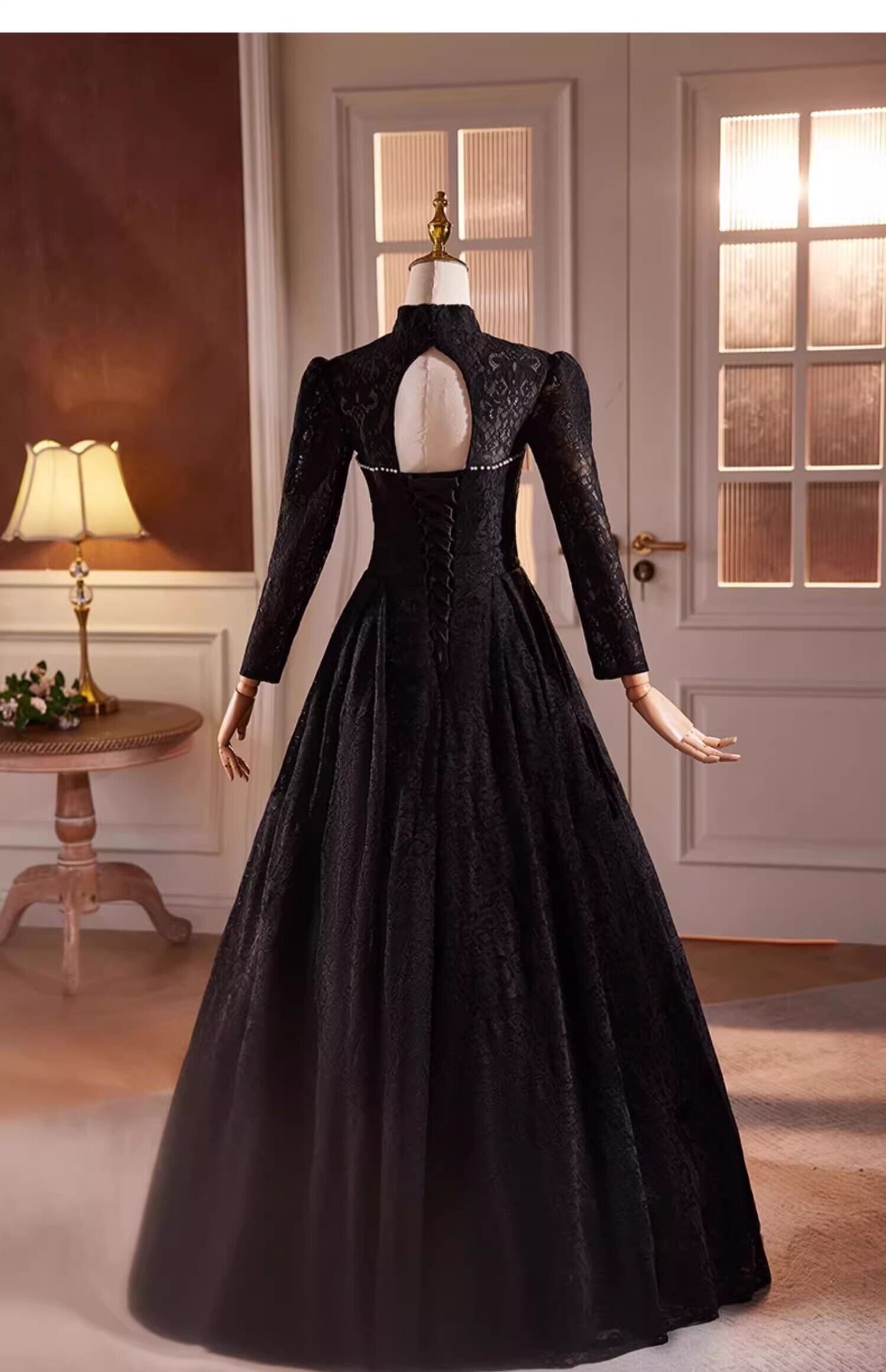 黒 カラードレス D立体レース刺繍 長袖 パーティードレス 演奏会/音楽会