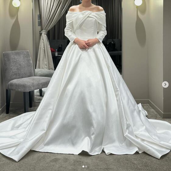 豪華!ウエディングドレス ロングトレーン オフショルダー 光沢サテン 結婚式/披露宴/演奏会/音楽会