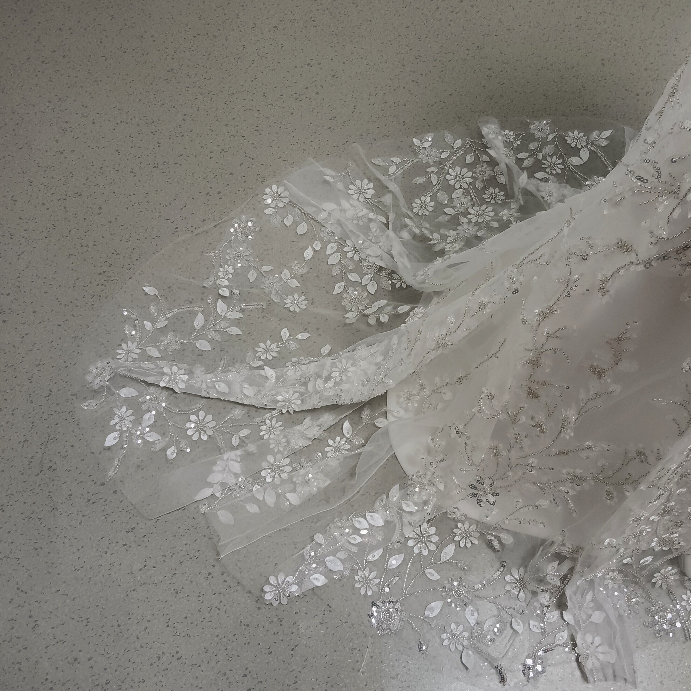 豪華!ウエディングドレス オフショルダー 編み上げ式 ブラトップ プリンセスライン 可憐な花刺繍 繊細なレース トレーン 披露宴/演奏会