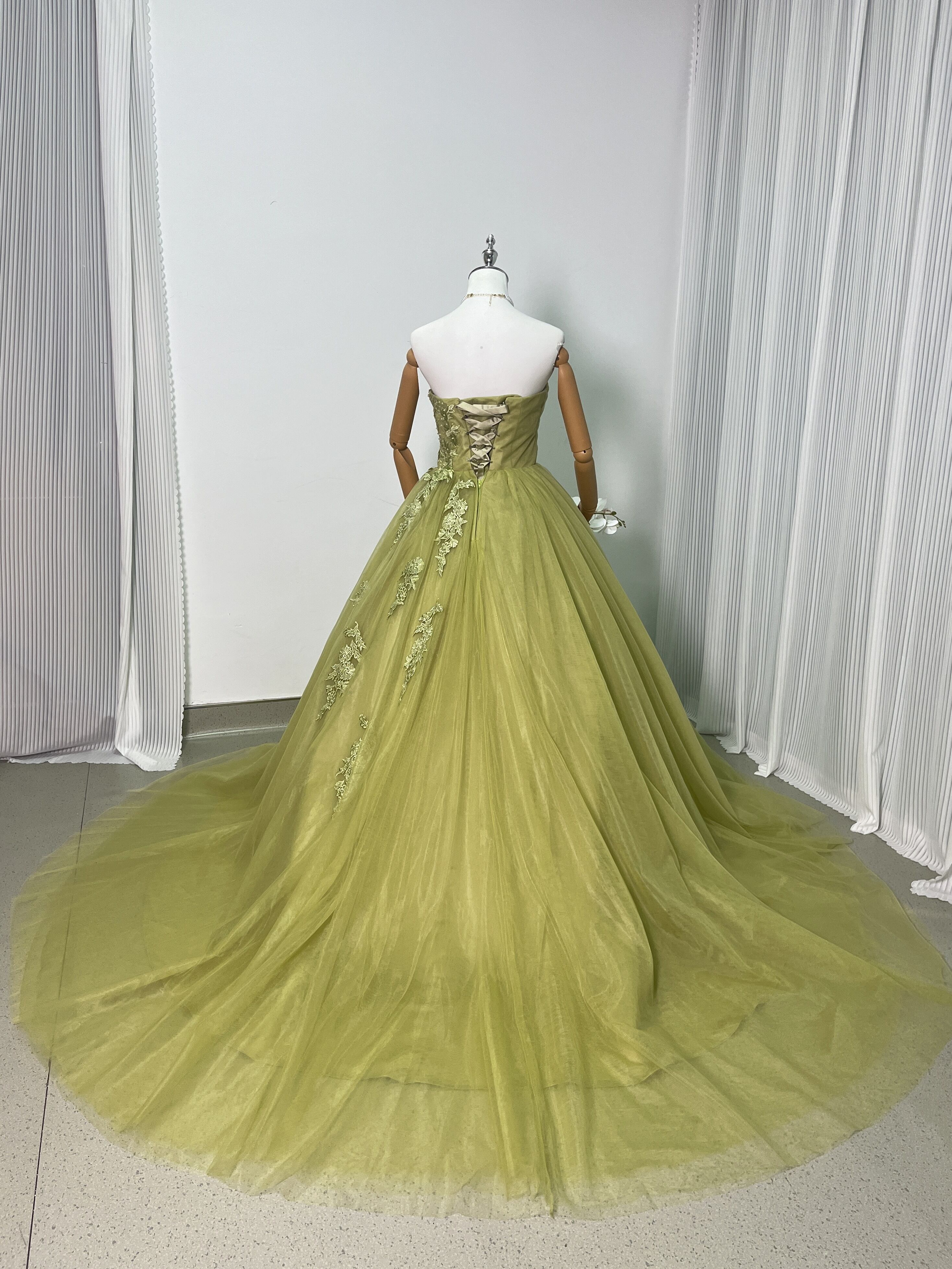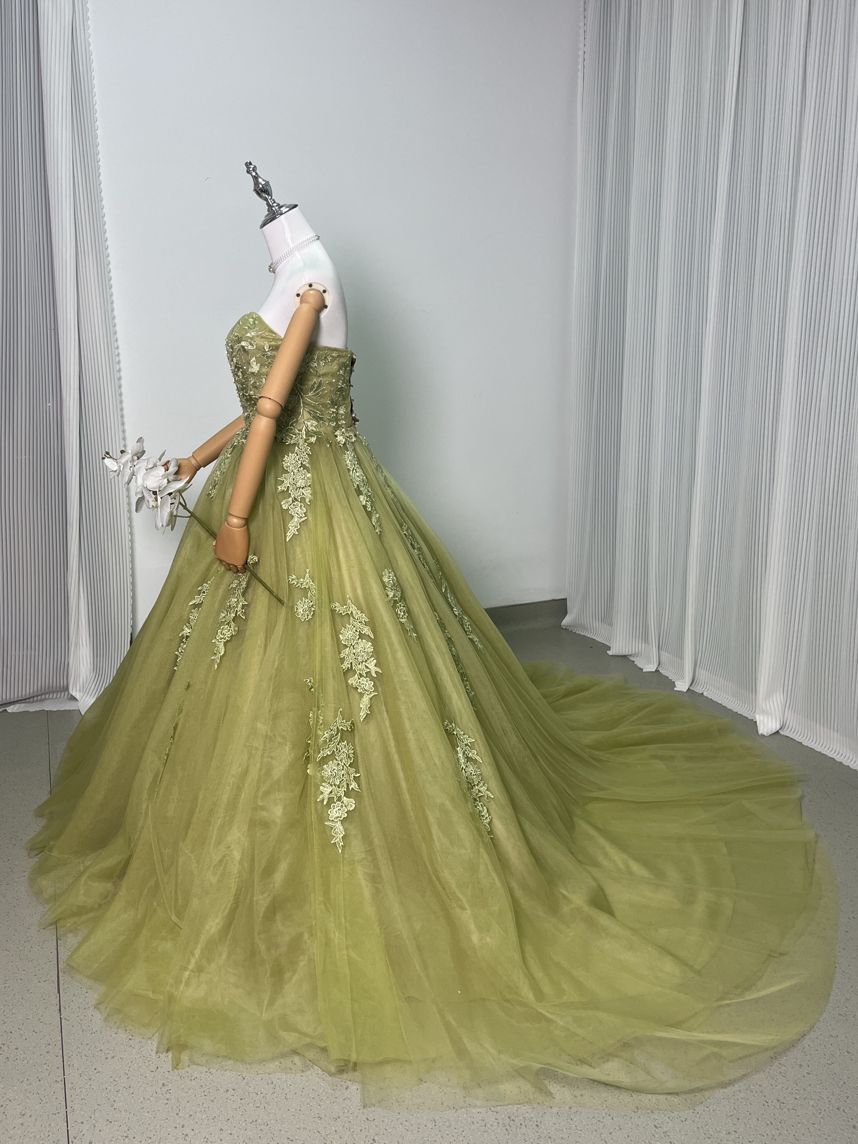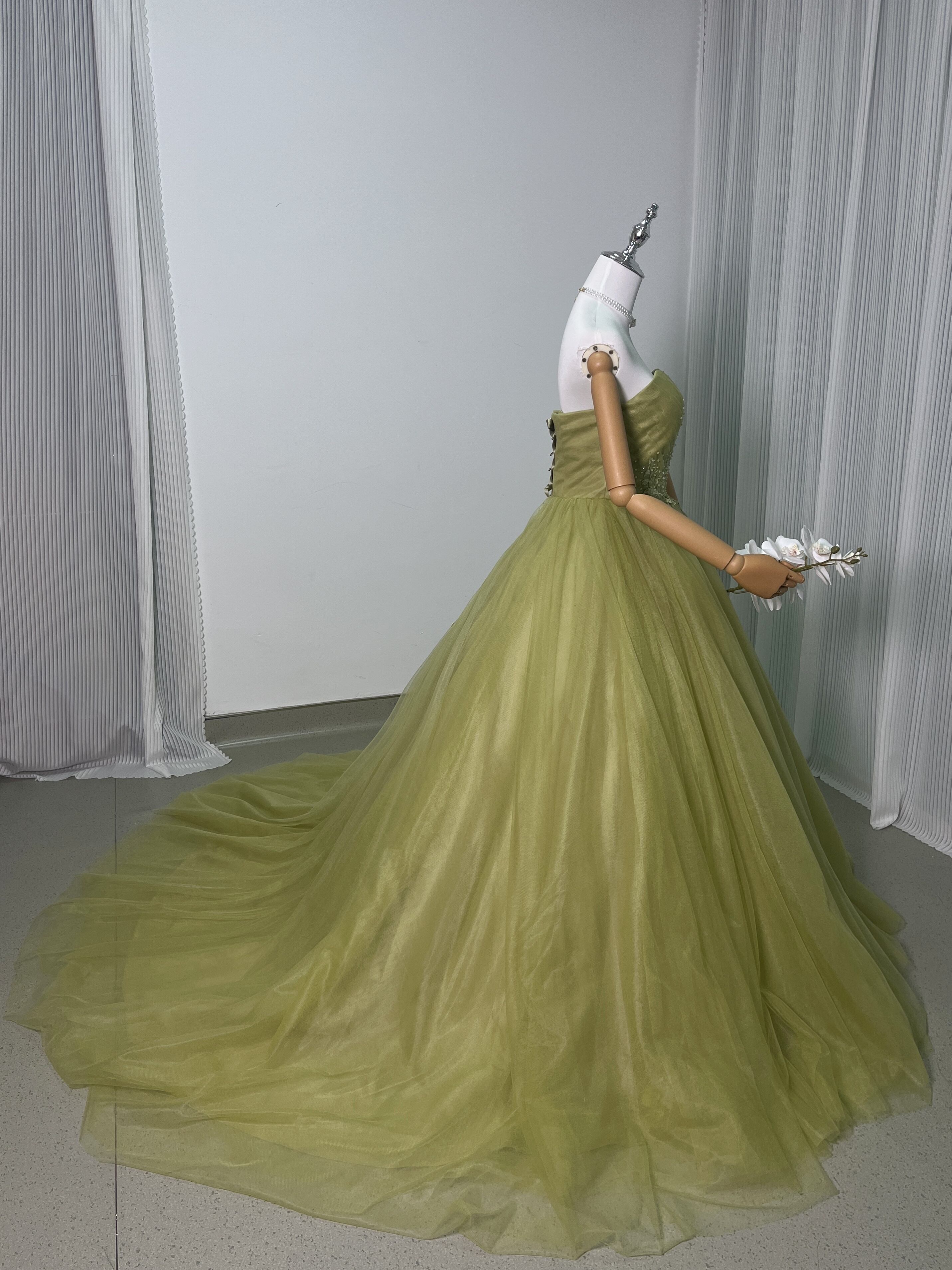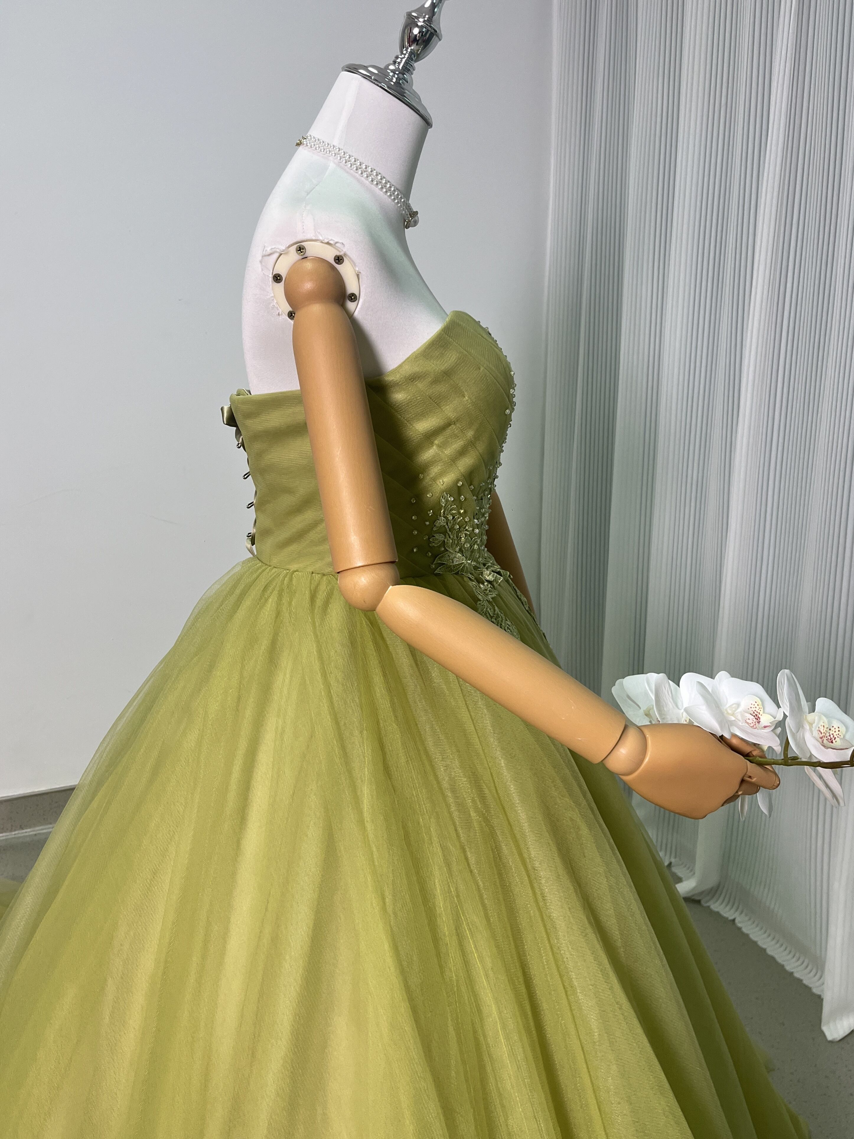 送料無料!グリーン 3D立体レース刺繍 カラードレス ソフトチュール パーティードレス 披露宴/演奏会/音楽会