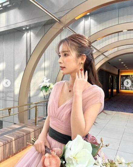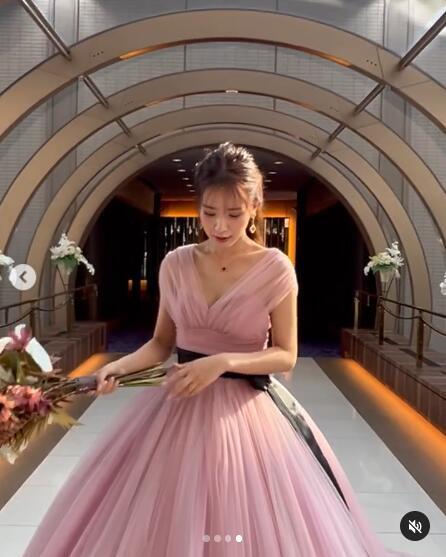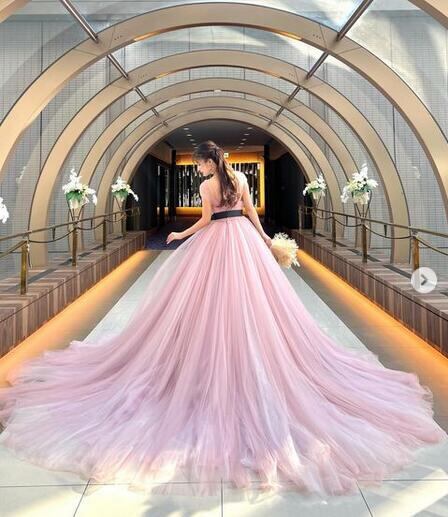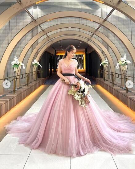 エレガント!ピンクカラードレス Vネックドレス ノースリーブ 柔らかく重ねたチュールドレス パーティードレス 前撮り
