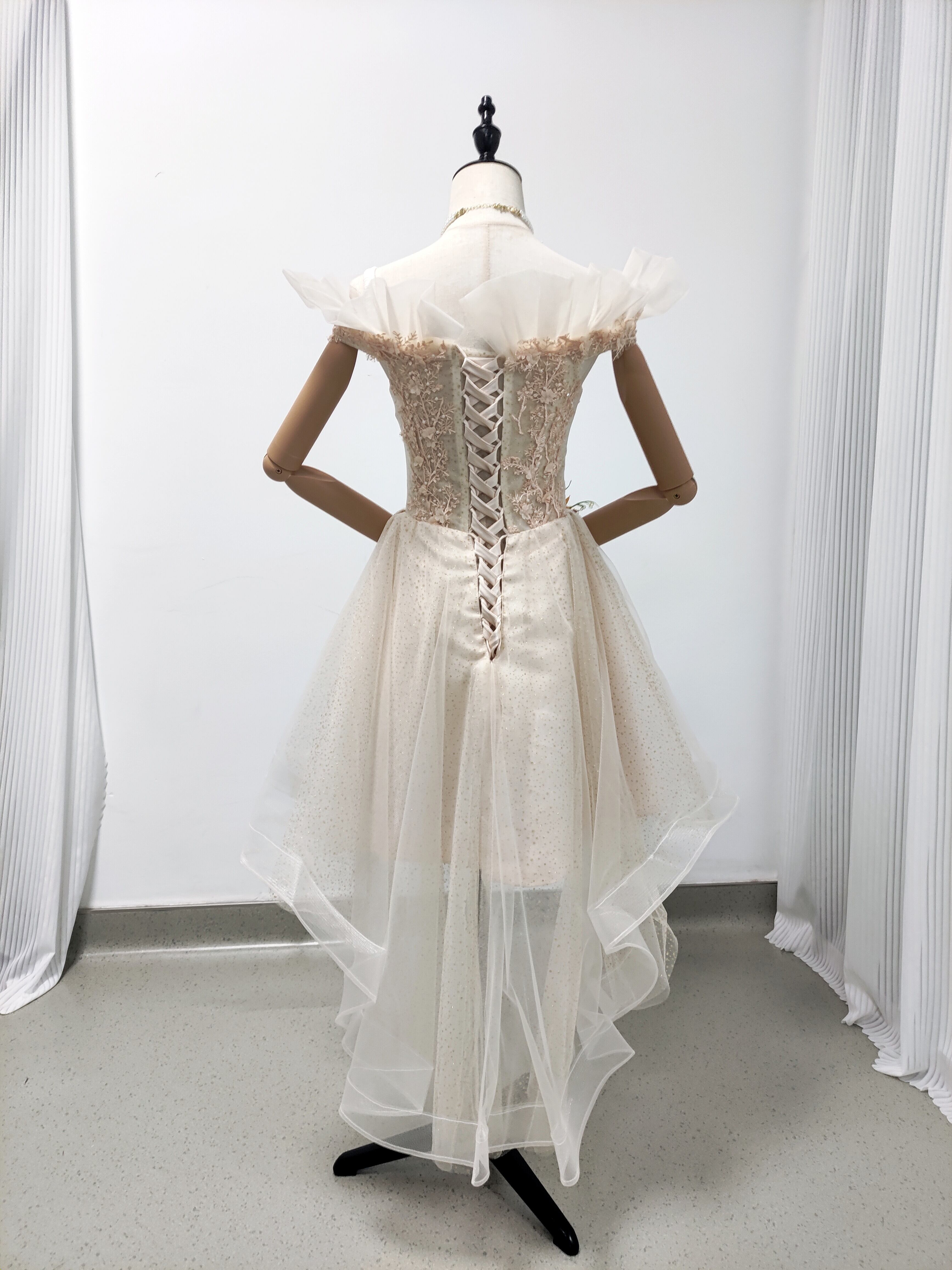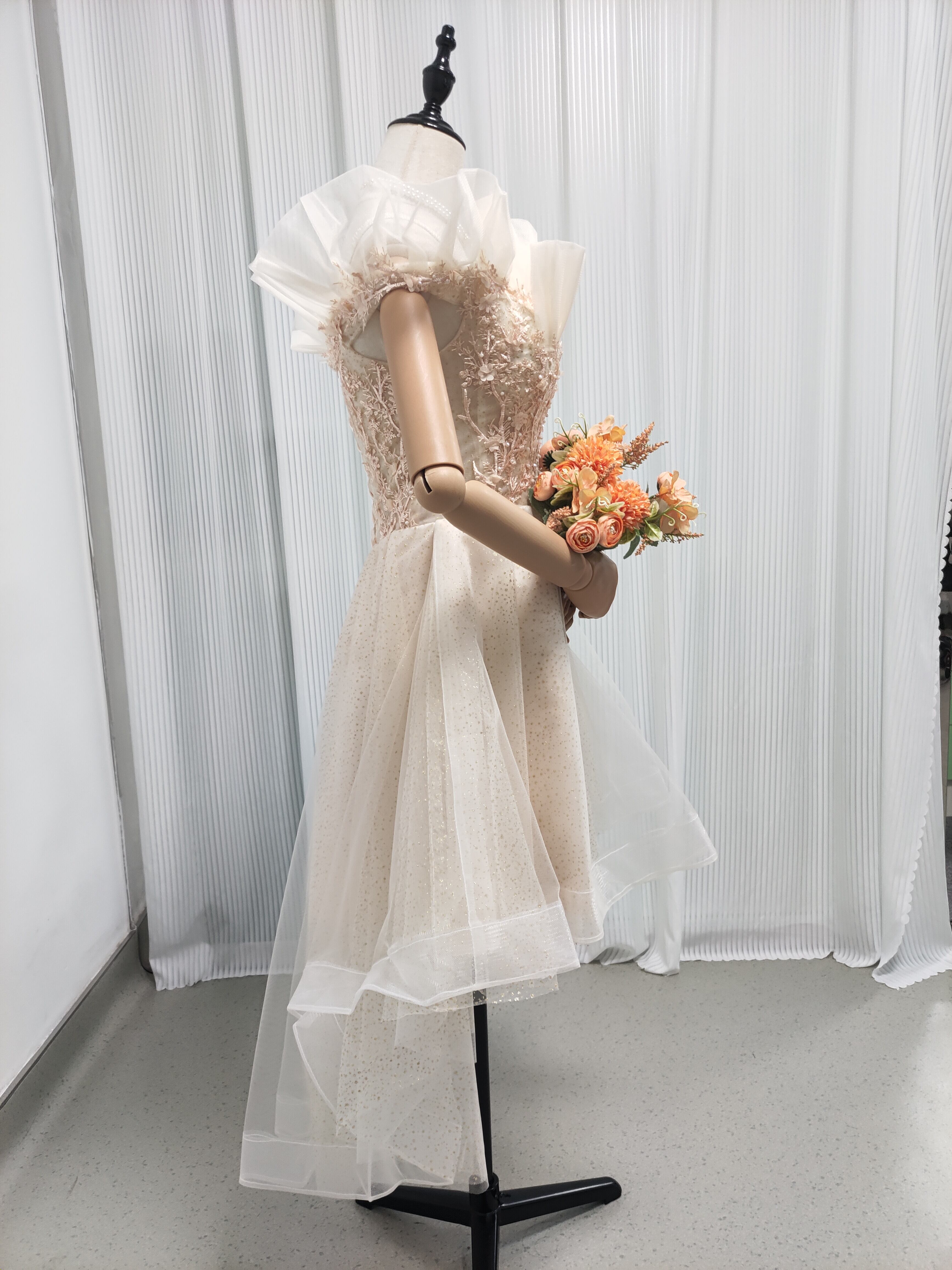 送料無料!美品!パーティードレス アンズの色 シャンパン色 スパンコール ミニドレス 編み上げ ステージドレス ピアノ演奏ドレス ミディアムドレス セレモニー | David1021k Dress(ダヴィドレス)