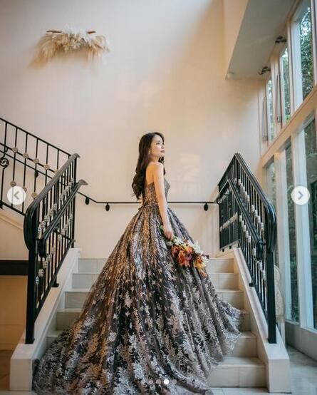 豪華!カラードレス 黒 上品レース ロングトレーン ビスチェタイプ 花柄のモチーフ刺繍が美しく 繊細レース 結婚式/披露宴