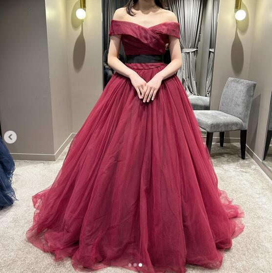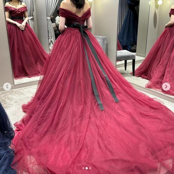 エレガント!カラードレス ワインレッド 柔らかく重ねたチュールスカート ロングトレーン オフショルダー リボン 結婚式/披露宴