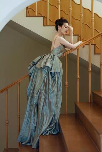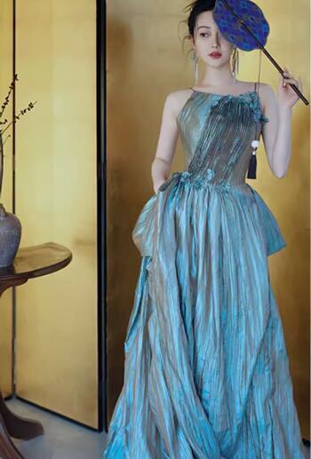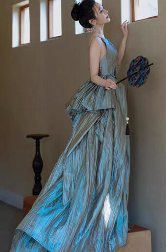 上品!パーティドレス カラードレス コントラスト色 爽やかで優しいブルー キャミソール アシンメトリー風 高みせ ふっくら柔らか ロング 背中見せ/バックレス 前撮り 結婚式 | David1021k Dress(ダヴィドレス)