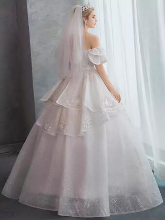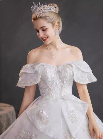 豪華!パーティドレス 爽やかで優しい色 オフショルダー 高みせ ふっくら柔らか キラキラスパンコール プリンセスライン ロング 背中見せ/バックレス 前撮り 結婚式 | David1021k Dress(ダヴィドレス)