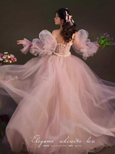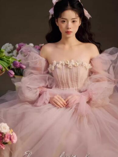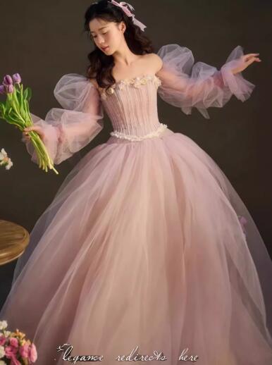 上品!パーティドレス カラードレス ピンク ボリューム感 長袖/ロングスリーブ 柔らかく重ねたチュール 背中見せ/バックレス 花 ふっくら柔らか プリンセスライン 編み上げ ロング 前撮り 結婚式 | David1021k Dress(ダヴィドレス)