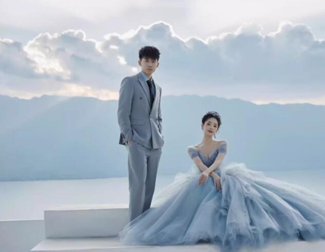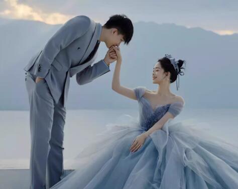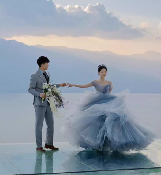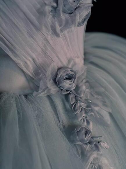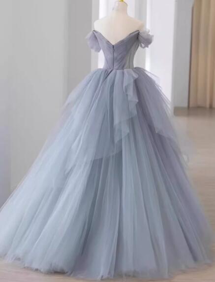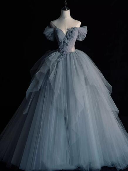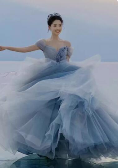 上品!パーティドレス カラードレス 爽やかで優しいブルー オフショルダー 柔らかく重ねたチュール 背中見せ/バックレス 花 編み上げ ロング ふっくら柔らか プリンセスライン 前撮り 結婚式 | David1021k Dress(ダヴィドレス)