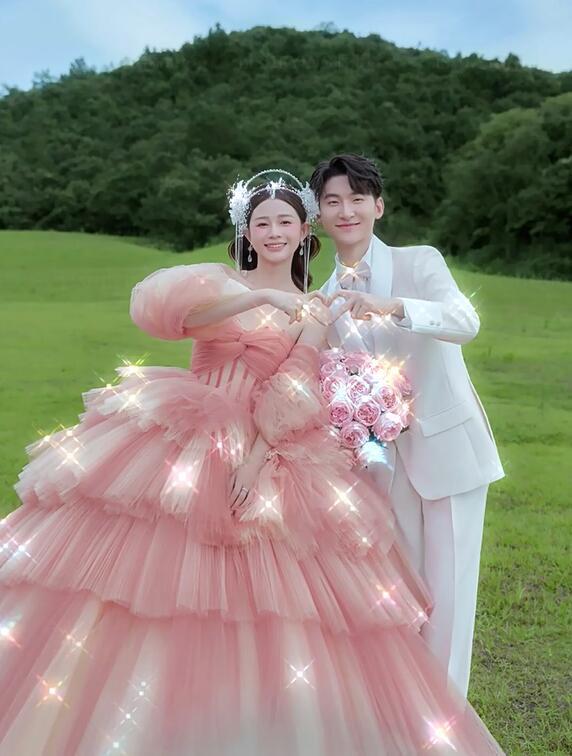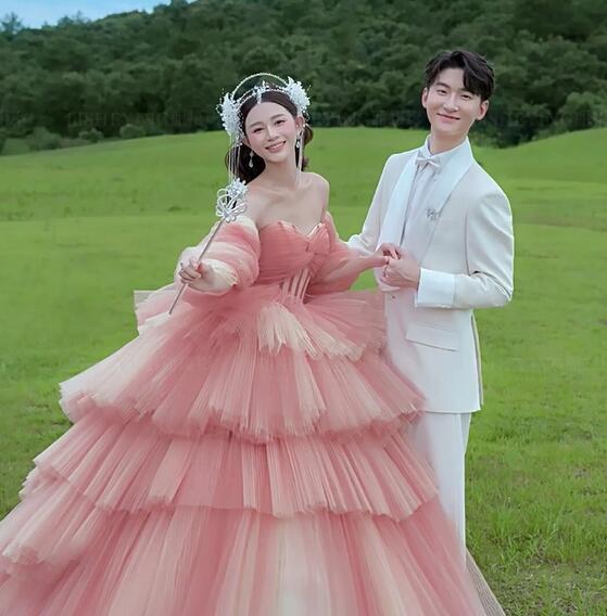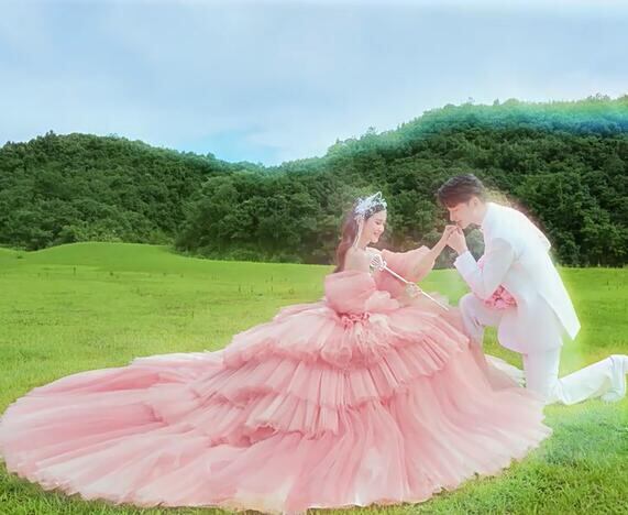 上品!パーティドレス カラードレス ピンク ソフトハートカット 柔らかく重ねたチュールスカート ビスチェドレス ロングトレーン ふっくら柔らか ボリューム感 前撮り パーティ/結婚式 | David1021k Dress(ダヴィドレス)