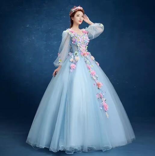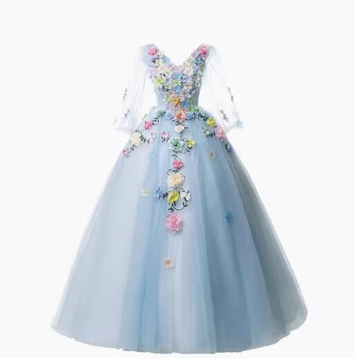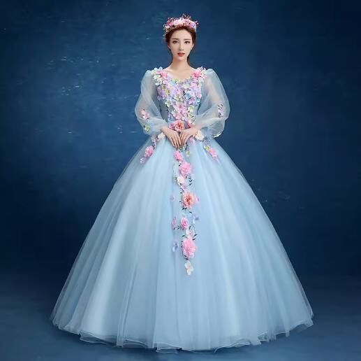 エレガント!パーティドレス カラードレス 爽やかで優しいブルー 3D立体レース刺繍 ふっくら柔らかな花リボン ロング 長袖/ロングスリーブ プリンセスライン 前撮り パーティ/結婚式 | David1021k Dress(ダヴィドレス)