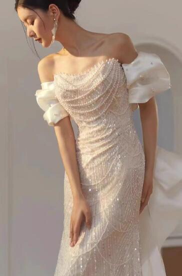 エレガント!パーティドレス キラキラスパンコール ビーズ/パール パフスリーブ ふっくら柔らかなバックリボン ロング オフショルダー マーメイドライン 前撮り パーティ/結婚式 | David1021k Dress(ダヴィドレス)