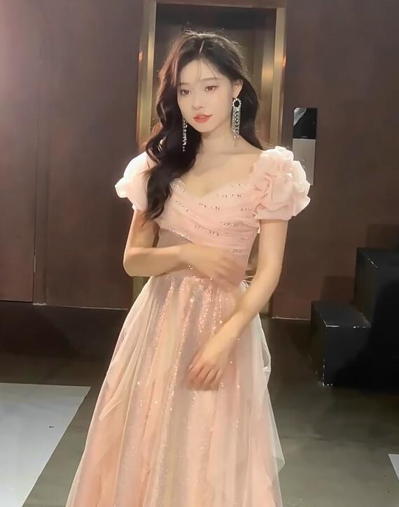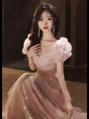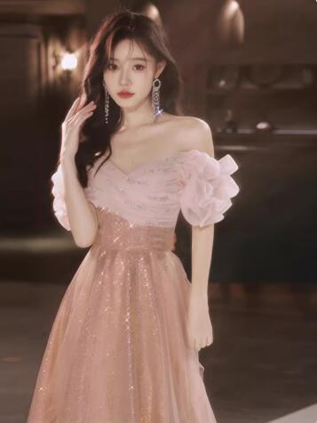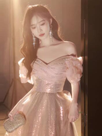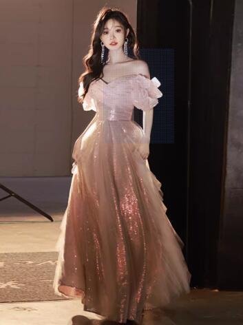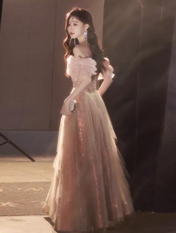エレガント!パーティドレス カラードレス オフショルダー キラキラチュール Vネックドレス 柔らかく重ねたチュールスカート ロング 前撮り パーティ/結婚式 | David1021k Dress(ダヴィドレス)