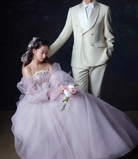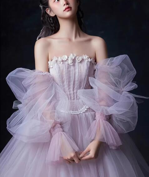 豪華!パーティドレス カラードレス パープル/紫 ラベンダー色 花リボン ビスチェドレス 柔らかく重ねたチュールスカート 上品レース ロング 取り外し袖 前撮り パーティ/結婚式 | David1021k Dress(ダヴィドレス)