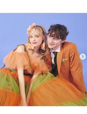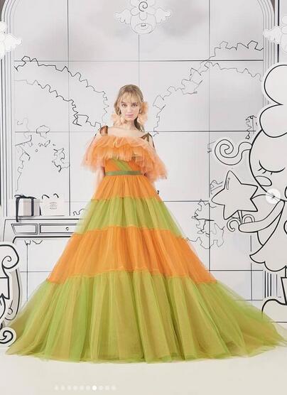 上品!カラードレス ライムグリーン コントラスト色 キャミソール オレンジ色 柔らかく重ねたチュールスカート 前撮り パーティー/披露宴/結婚式/花嫁/二次会 | David1021k Dress(ダヴィドレス)