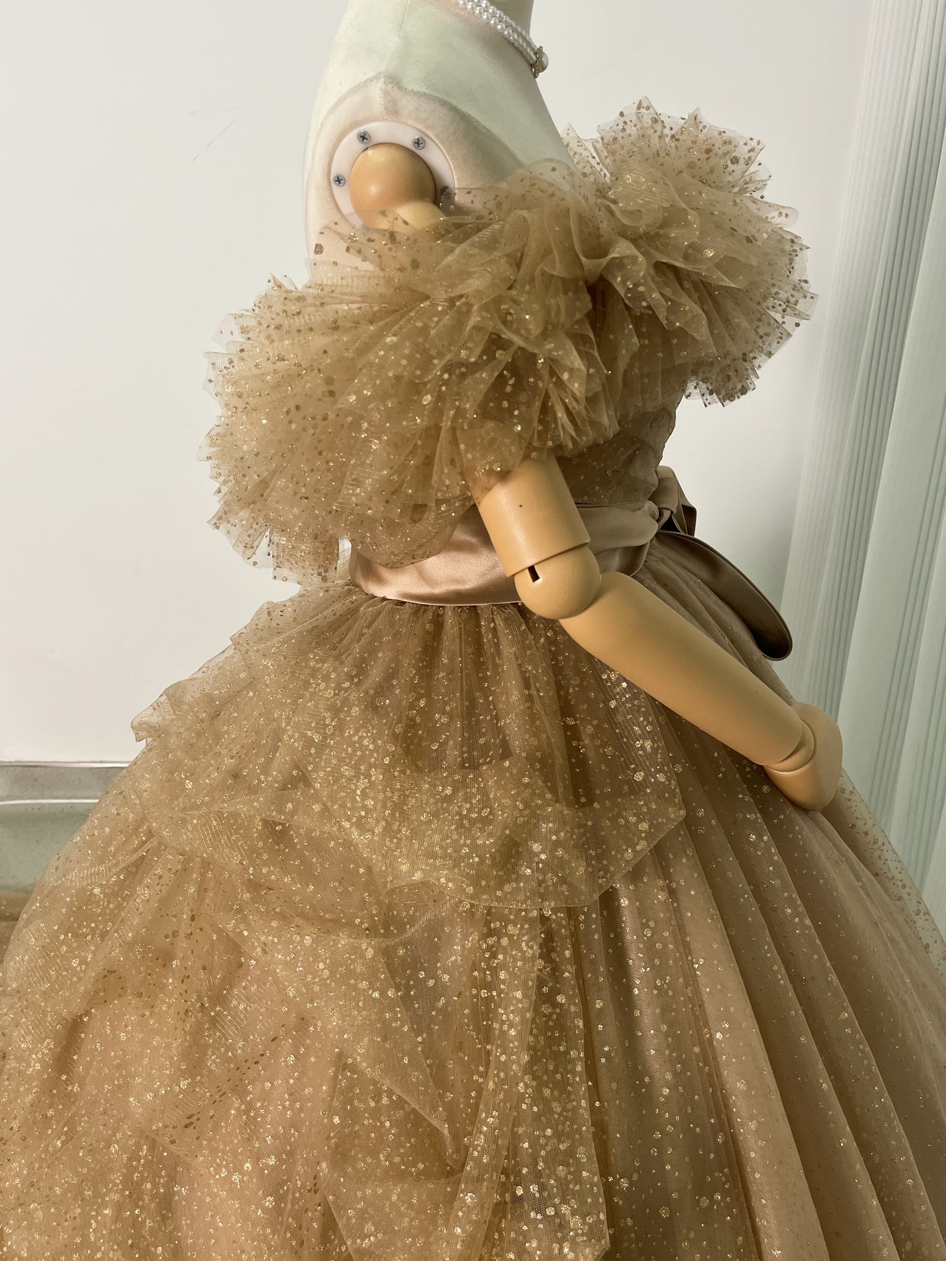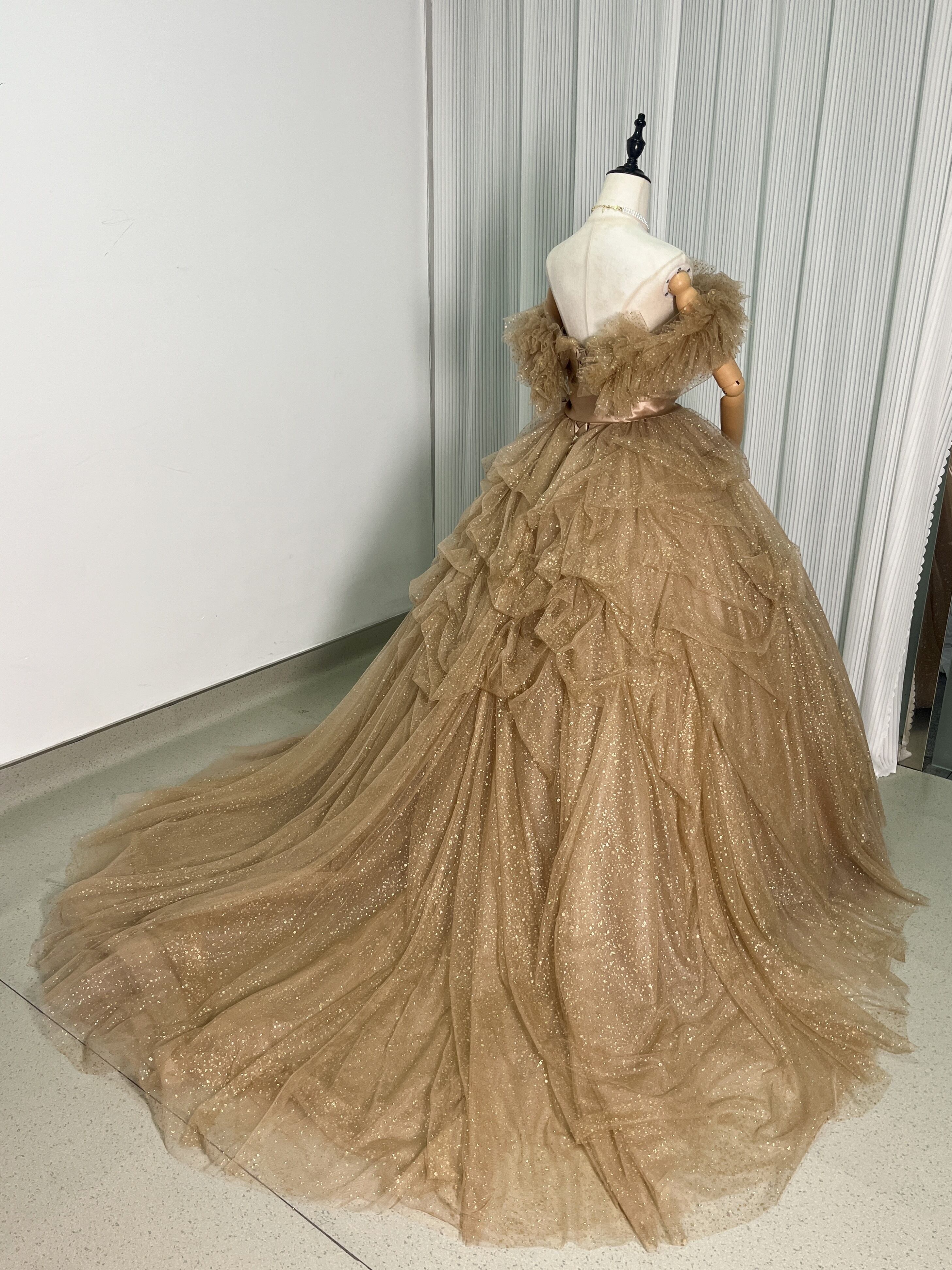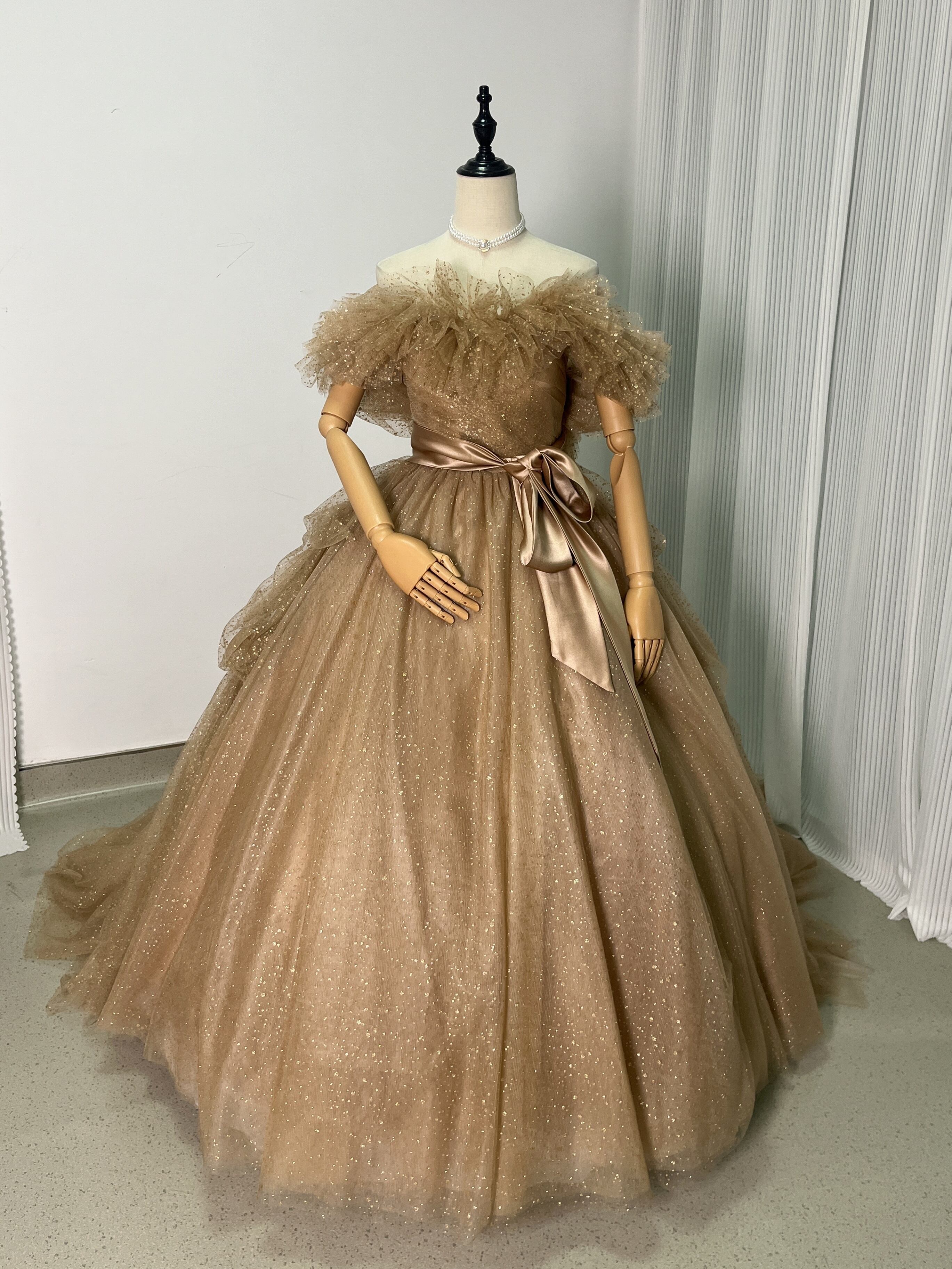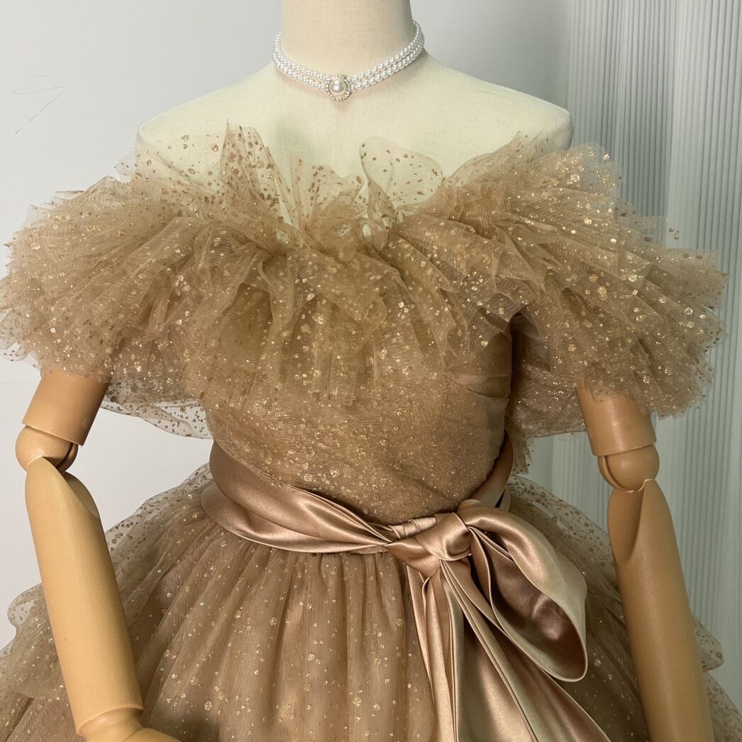 高品質!取り外しオフショルダー シャンパン色 キラキラチュール シースルー袖 カラードレス 華やかなトレーン /結婚式/披露