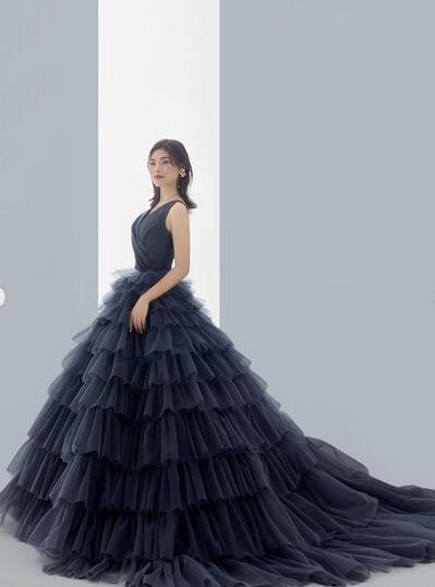 高品質!カラードレス 黒 フリフリ プリンセスライン ノースリーブ 柔らかく重ねたチュールスカート 前撮り トレーン/ロング(ご指定自由)!パーティー/披露宴/結婚式/花嫁/二次会 | David1021k Dress(ダヴィドレス)