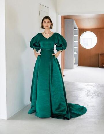 上品!カラードレス グリーン プリンセスライン パフスリープ Vネック 高級サテン 前撮り パーティー/披露宴/結婚式/花嫁/二次会