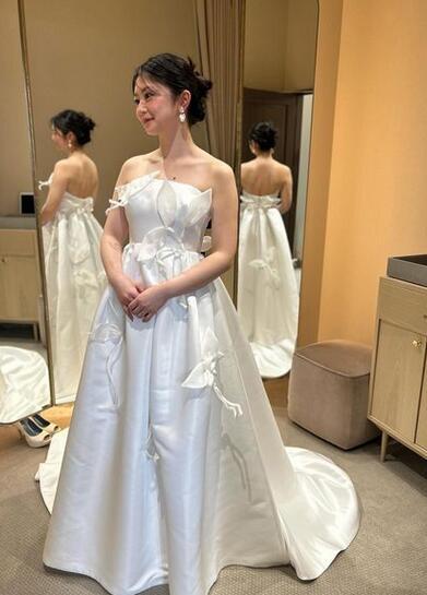 上品!トレーン/ロング(ご指定自由)!ウエディングドレス 白 オフホワイト リボン 色変更可能 ビスチェドレス 高級サテン 前撮り パーティー/披露宴/結婚式/花嫁/二次会 | David1021k Dress(ダヴィドレス)