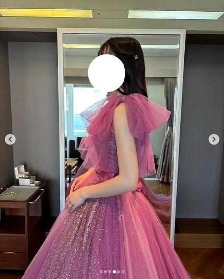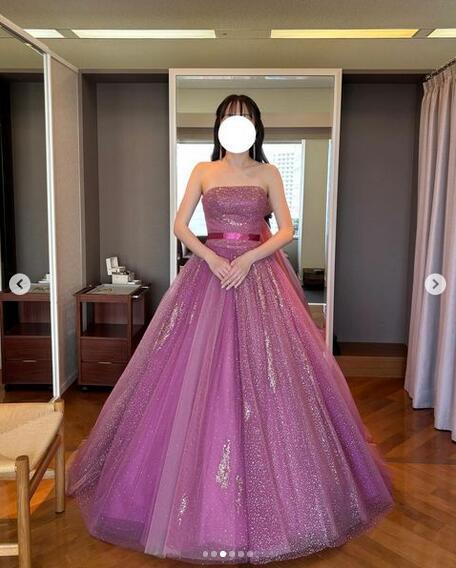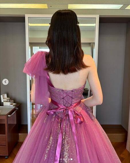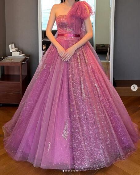 上品!ピンクカラードレス ワンショルダー ビスチェドレス ラメチュール Aラインドレス 前撮り パーティードレス 司会者/披露宴/結婚式/花嫁/二次会 | David1021k Dress(ダヴィドレス)
