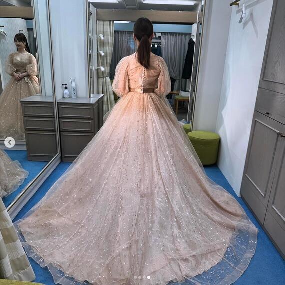 送料無料!カラードレス Vネック 七分袖 リボン 胸元ハートカート ウエディングドレス ソフトチュール プリンセスライン トレーン/ロング(ご指定自由)!前撮り パーティー/披露宴/結婚式/花嫁/二次会 | David1021k Dress(ダヴィドレス)