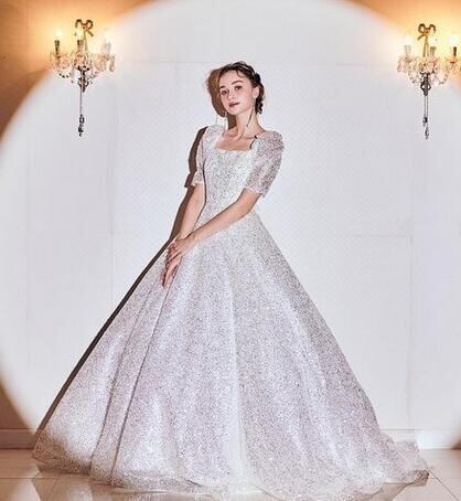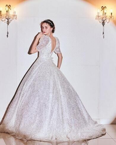 上品!ウエディングドレス 短袖 キラキラチュール 背中見せ/バックレス プリンセスライン リボン トレーン/ロング(ご指定自由)!前撮り パーティー/披露宴/結婚式/花嫁/二次会 | David1021k Dress(ダヴィドレス)